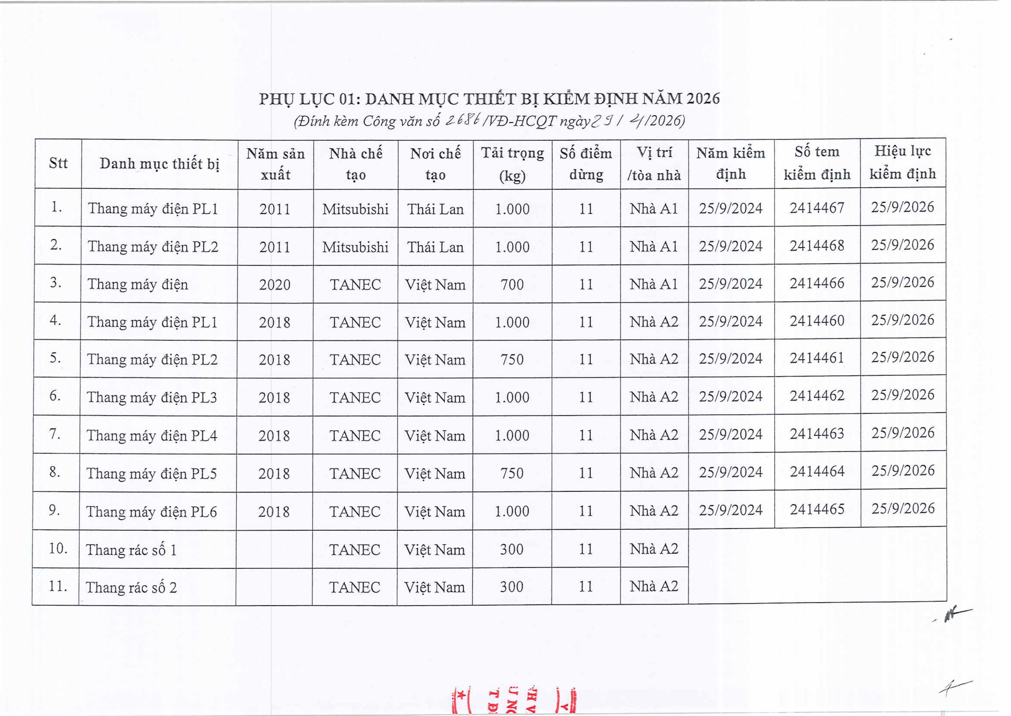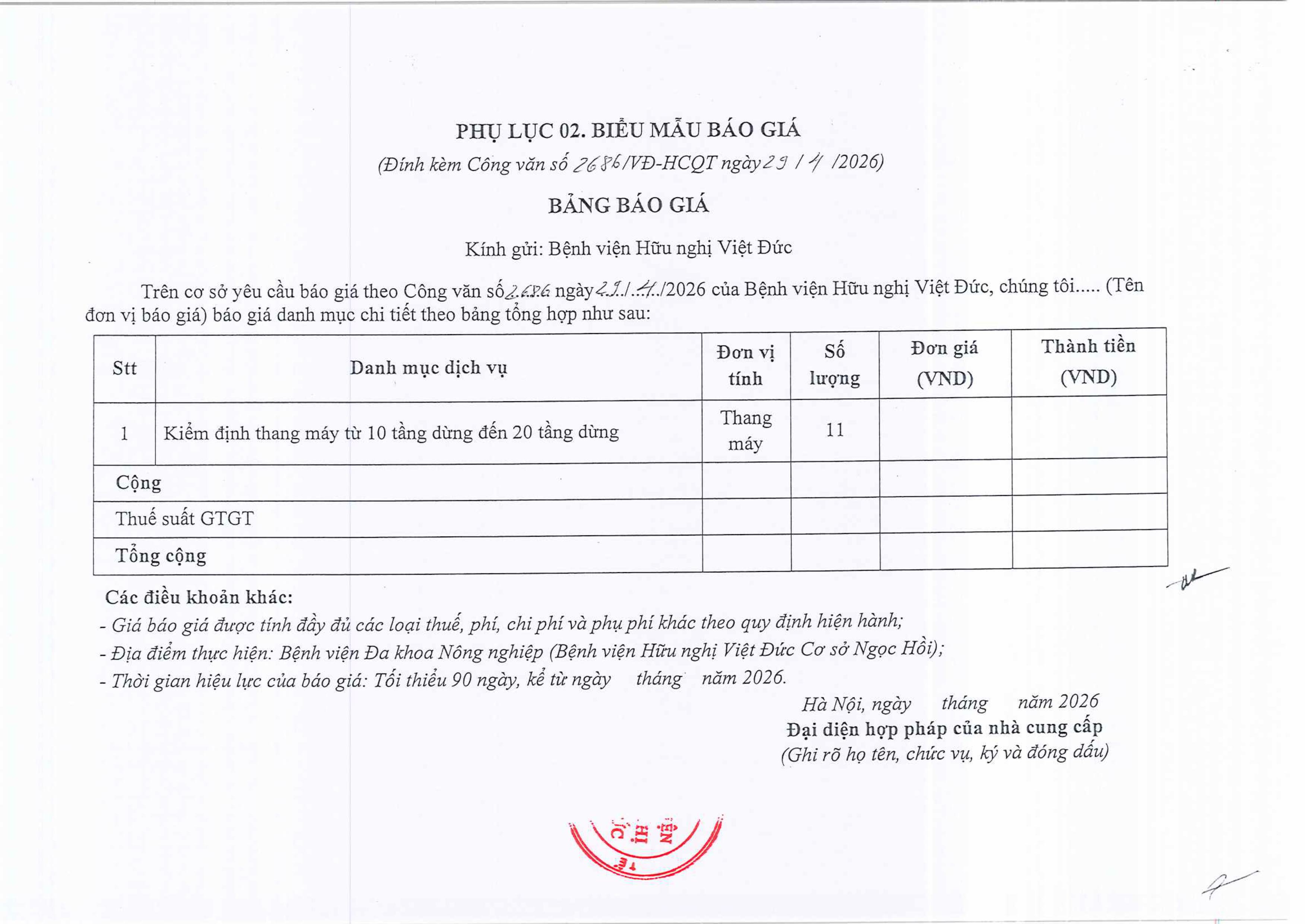 Bệnh viện Đa khoa Nông nghiệp (Bệnh viện Hữu nghị Việt Đức Cơ sở Ngọc Hồi) có nhu cầu báo giá dịch vụ kiểm định thang máy của bệnh viện năm 2026