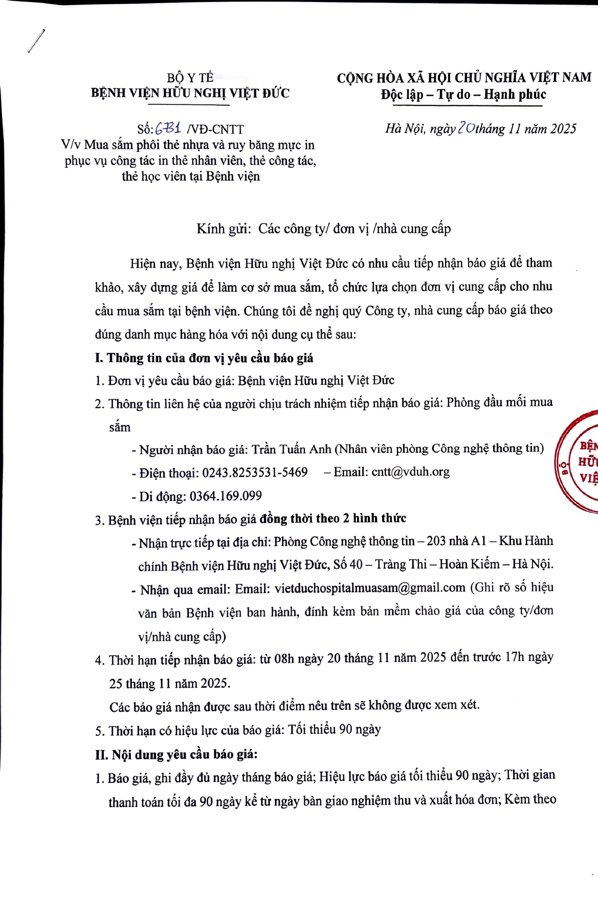 Bệnh viện Hữu Nghị Việt Đức đang có nhu cầu tiếp nhận báo giá để tham khảo xây dựng giá gói thầu làm cơ sở tổ chức lựa chọn nhà thầu cho gói thầu: Cung cấp dịch vụ sửa chữa 04 bơm tiêm điện nhãn AlarisTMGuardrailsTM Plus CC Hãng/ nước chủ sở hữu: BD Switzerland Sàrl, Thuỵ Sĩ/ Hãng/ nước sản xuất: Plexus Services RO SRL, Romania tại Khoa HSTC I với nội dung cụ thể như sau: