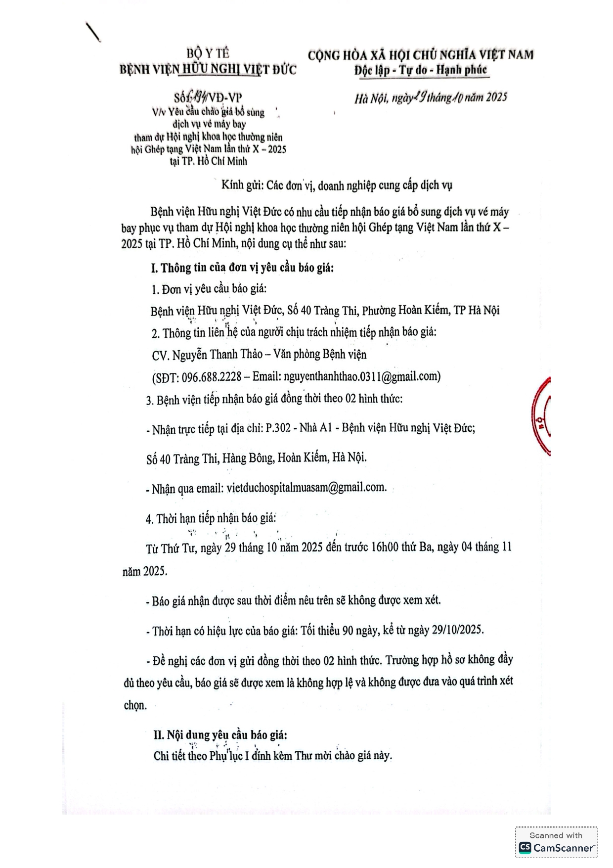 Hiện nay, Bệnh viện Hữu nghị Việt Đức đang có nhu cầu mua sắm hóa chất, sinh phẩm phục vụ thực hiện xét nghiệm Realtime PCR khẳng định SARS-CoV-2 để phục vụ công tác chuyên môn tại Bệnh viện. Để có cơ sở xây dựng giá dự toán, Bệnh viện Hữu nghị Việt Đức mời các đơn vị, doanh nghiệp có khả năng cung cấp chào giá, chi tiết theo công văn này.