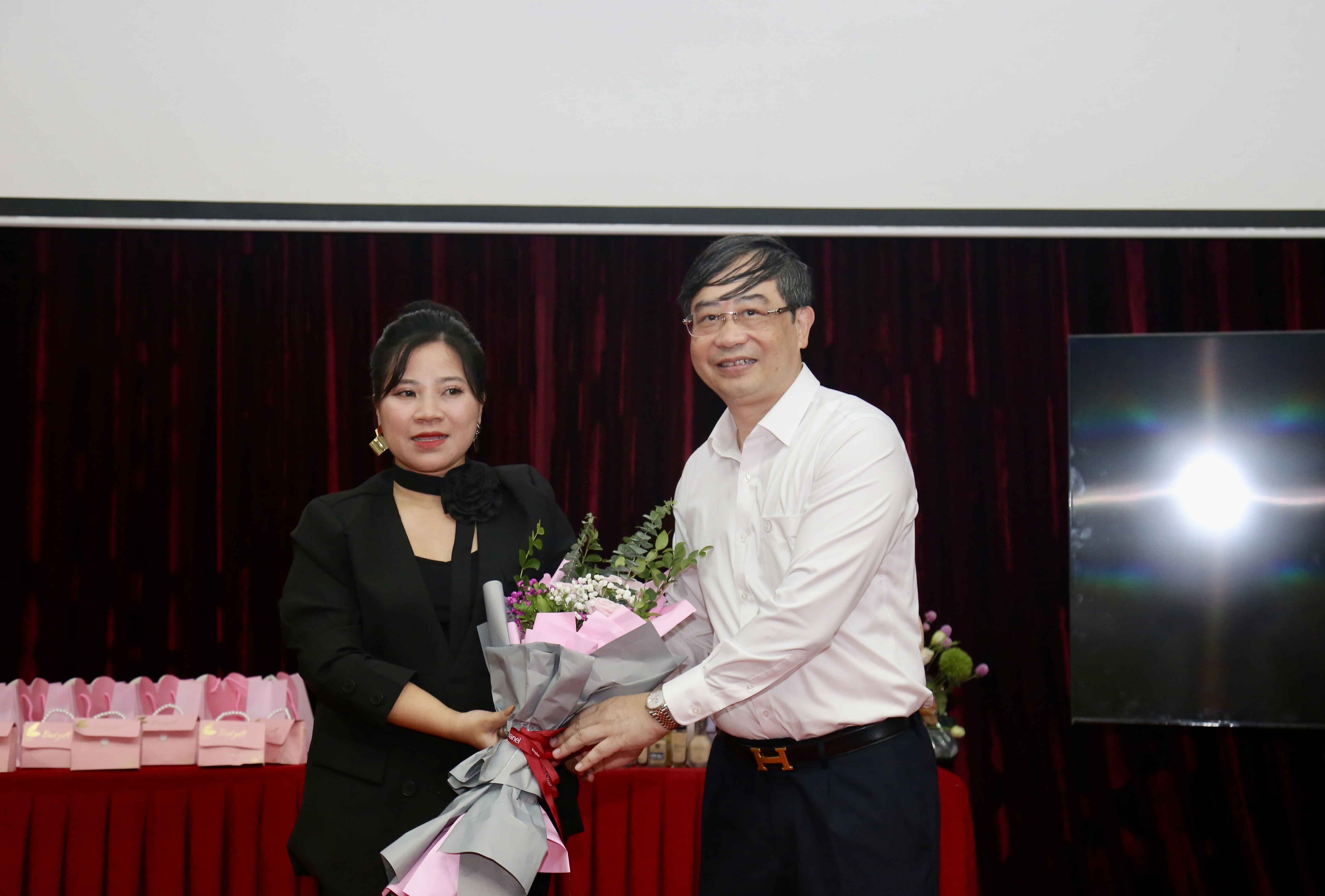 PGS.TS Lê Tư Hoàng – Chủ tịch Công đoàn Bệnh viện tặng hoa cảm ơn chuyên gia hướng dẫn kỹ năng làm đẹp cơ bản tại sự kiện