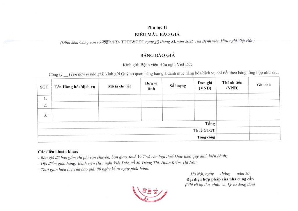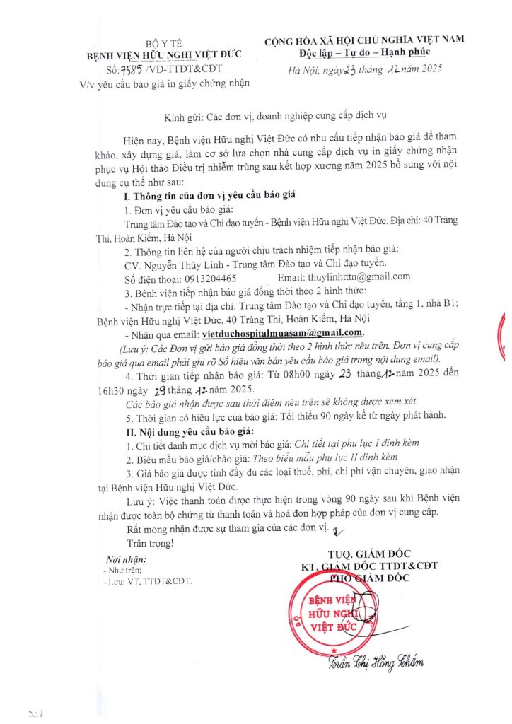 Bệnh viện HN Việt Đức có nhu cầu báo giá in giấy chứng nhận