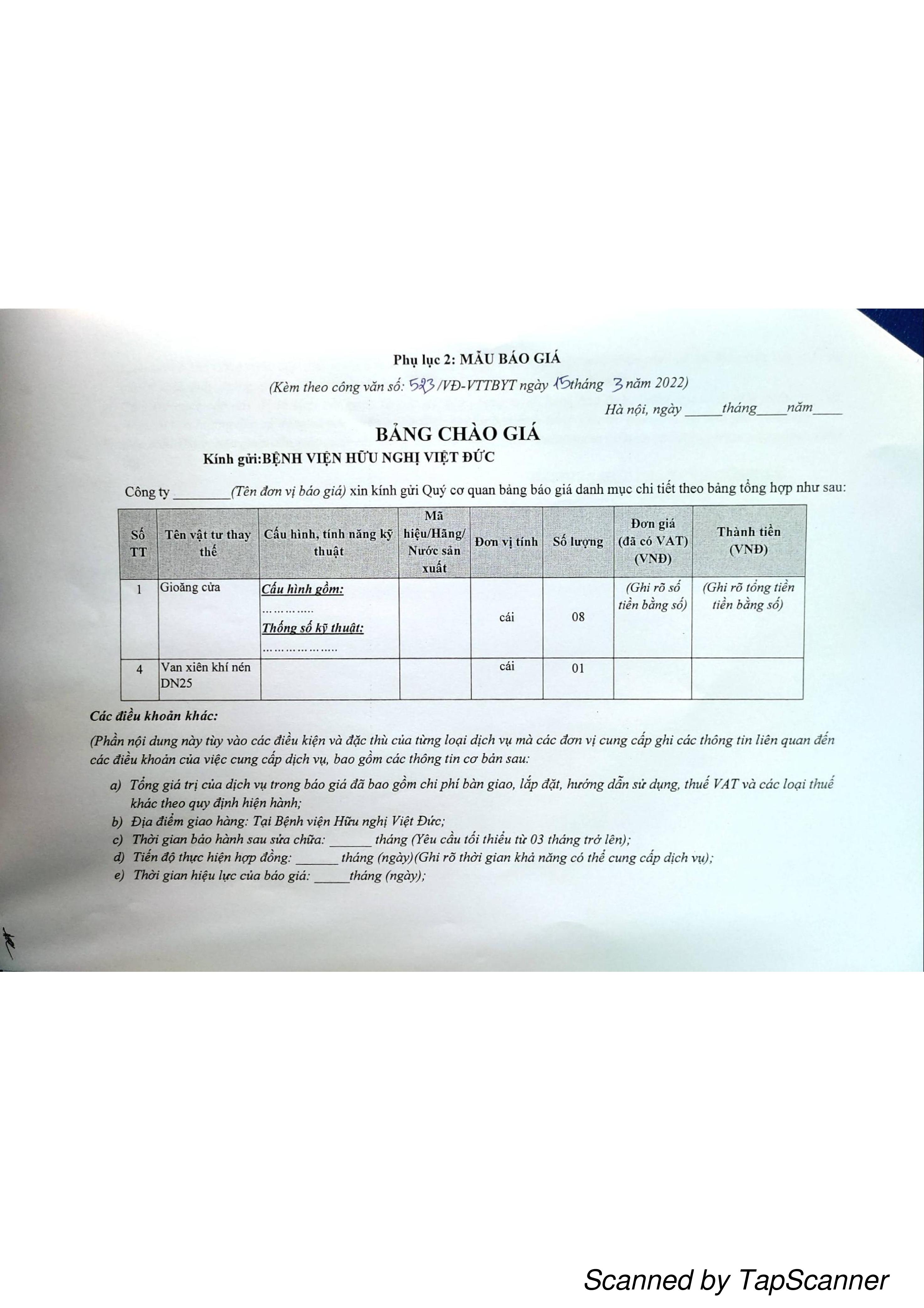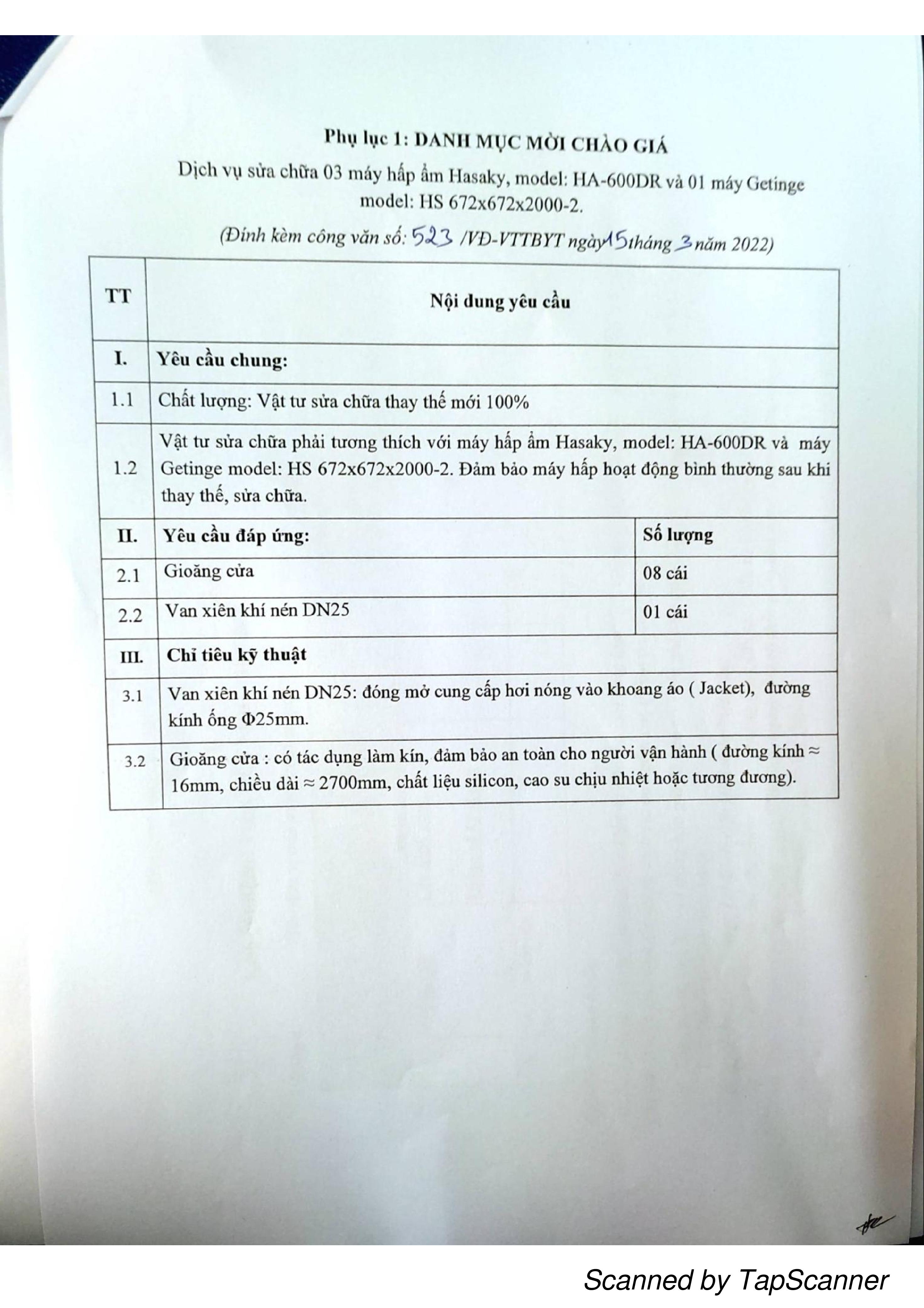 Hiện nay, Bệnh viện Hữu nghị Việt Đức đang có nhu cầu sửa chữa 03 máy hấp ẩm Hasaky, model:HA-600 DR và 01 máy Getinge model: HS 672x672x2000-2 (chi tiết nội dung tại phụ lục 1 kèm theo). Để có cơ sở tham khảo giá trên thị trường, Bệnh viện Hữu nghị Việt Đức mời các đơn vị, doanh nghiệp kinh doanh có khả năng cung cấp chào giá theo phụ lục 2 đính kèm.
