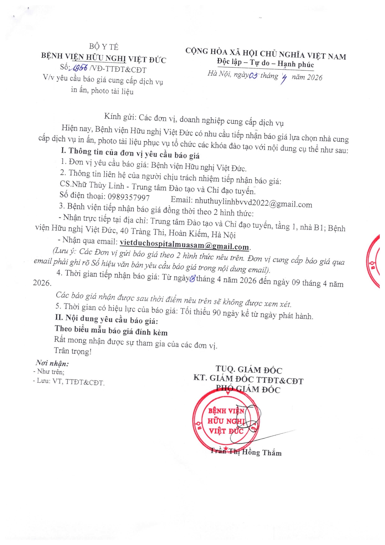 Hiện nay, Bệnh viện Hữu nghị Việt Đức đang có nhu cầu mua hóa chất và vật tư tiêu hao phục vụ xét nghiệm năm 2023 – 2024 (lần 3) tại Bệnh viện. Để có cơ sở thực hiện mua sắm, Bệnh viện Hữu nghị Việt Đức mời các đơn vị, doanh nghiệp có khả năng cung cấp chào giá, chi tiết theo công văn này.