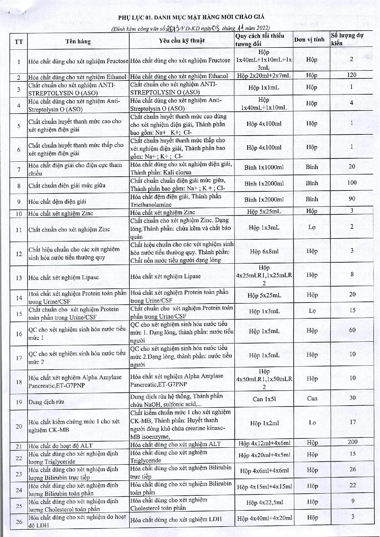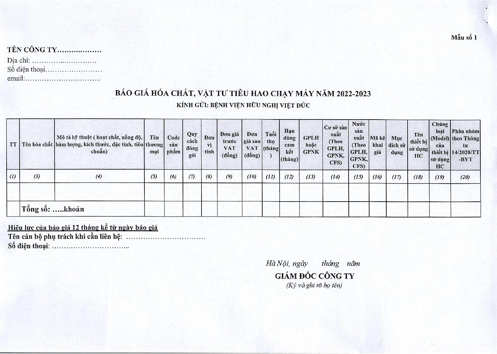 Hiện nay, Bệnh viện Hữu nghị Việt Đức đang có nhu cầu mua sắm Hóa chất, vật tư tiêu hao năm 2022-2023. Để có cơ sở xây dựng giá dự toán, Bệnh viện Hữu nghị Việt Đức mời các đơn vị, doanh nghiệp có khả năng cung cấp chào giá, chi tiết theo công văn này.