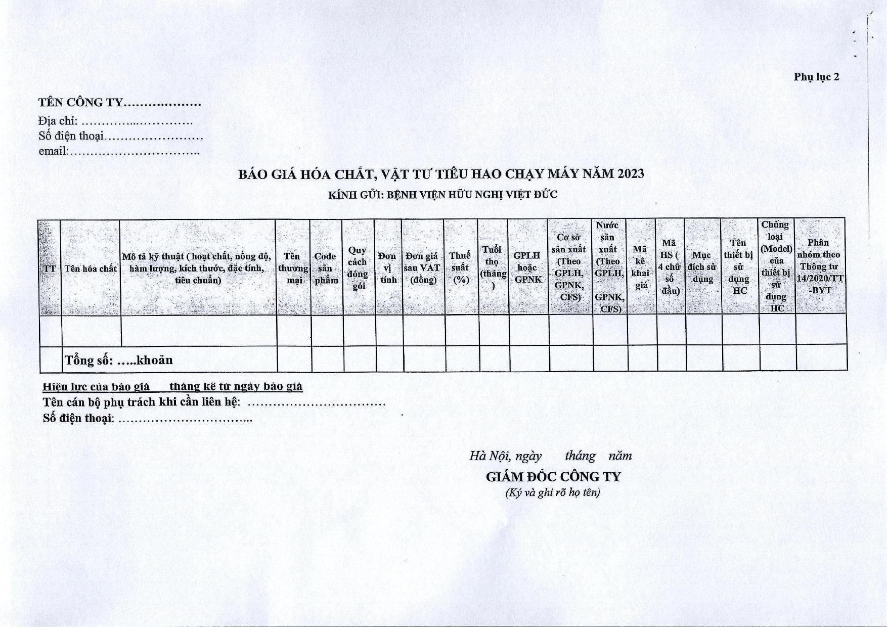 Hiện nay, Bệnh viện Hữu nghị Việt Đức đang có nhu cầu mua hóa chất, vật tư tiêu hao năm 2023 – 2024 tại Bệnh viện. Để có cơ sở xây dựng giá dự toán, Bệnh viện Hữu nghị Việt Đức mời các đơn vị, doanh nghiệp có khả năng cung cấp chào giá, chi tiết theo công văn này.