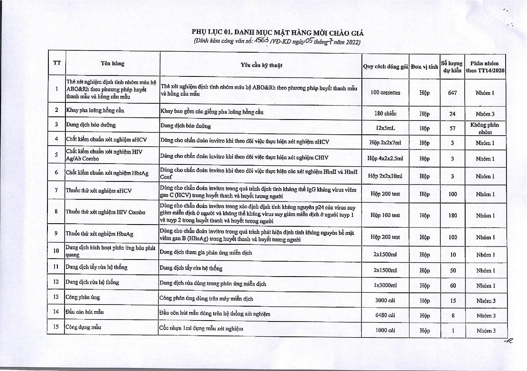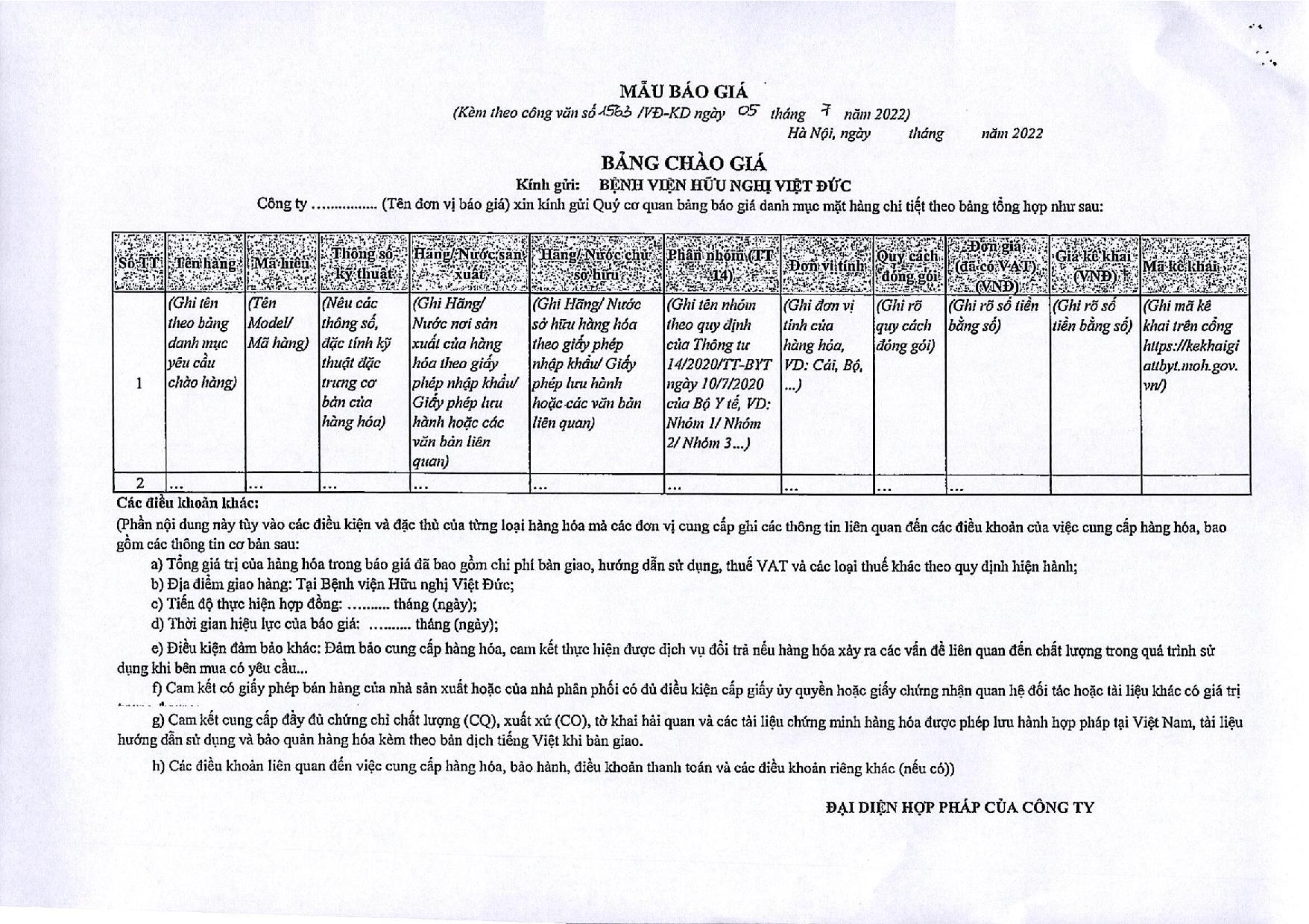 Hiện nay, Bệnh viện Hữu nghị Việt Đức đang có nhu cầu mua sắm một số hóa chất phục vụ công tác chuyên môn tại Bệnh viện. Để có cơ sở xây dựng giá dự toán, Bệnh viện Hữu nghị Việt Đức mời các đơn vị, doanh nghiệp có khả năng cung cấp chào giá, chi tiết theo công văn này.