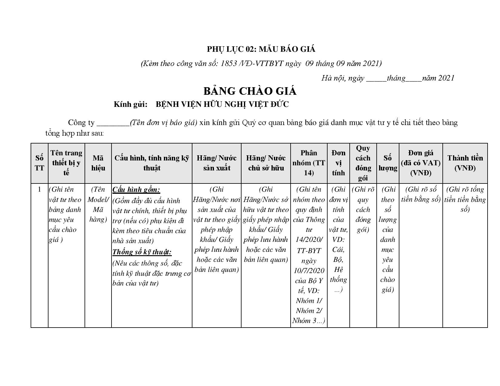 Hiện nay Bệnh viện HN Việt Đức đang có nhu cầu mua sắm vật tư y tế, để có cơ sở giá các vật tư này trên thị trường, bệnh viện kính mời các đơn vị, doanh nghiệp kinh doanh có khả năng chào giá các loại vật tư y tế (theo danh mục vật tư y tế theo phụ lục 01 đính kèm)