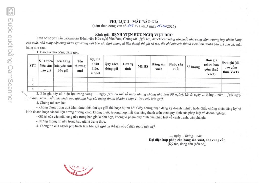 Hiện nay, Bệnh viện Hữu nghị Việt Đức đang có nhu cầu mua sắm bông băng gạc. Để có cơ sở thực hiện mua sắm, Bệnh viện Hữu nghị Việt Đức mời các đơn vị, doanh nghiệp có khả năng cung cấp chào giá, chi tiết theo công văn Yêu cầu báo giá được đăng tải này.