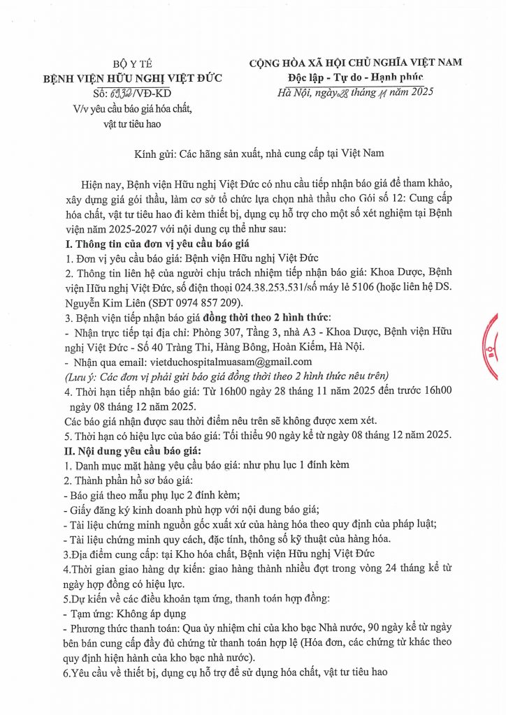 Bệnh viện HN Việt Đức yêu cầu báo giá Gói số 12: Cung cấp hóa chất, vật tư tiêu hao đi kèm thiết bị, dụng cụ hỗ trợ cho một số xét nghiệm tại Bệnh viện năm 2025-2027