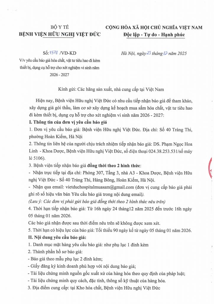 Hiện nay, Bệnh viện Hữu nghị Việt Đức đang có nhu cầu mua sắm Gói số 19: Cung cấp hóa chất, vật tư tiêu hao đi kèm thiết bị, dụng cụ hỗ trợ cho xét nghiệm vi sinh năm 2026 – 2027. Để có cơ sở thực hiện mua sắm, Bệnh viện Hữu nghị Việt Đức mời các đơn vị, doanh nghiệp có khả năng cung cấp chào giá, chi tiết theo công văn Yêu cầu báo giá được đăng tải này. Chi tiết xem tại đây.
