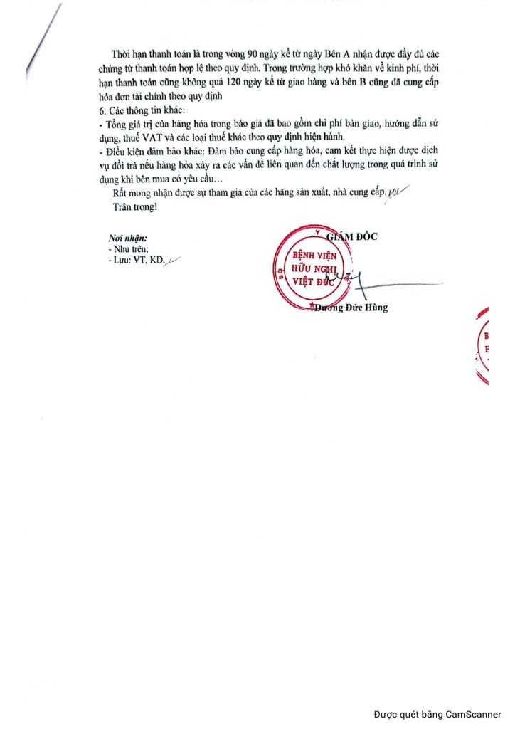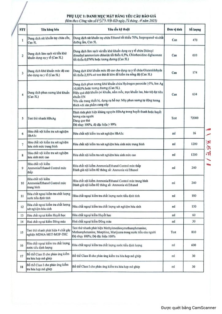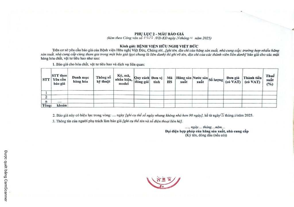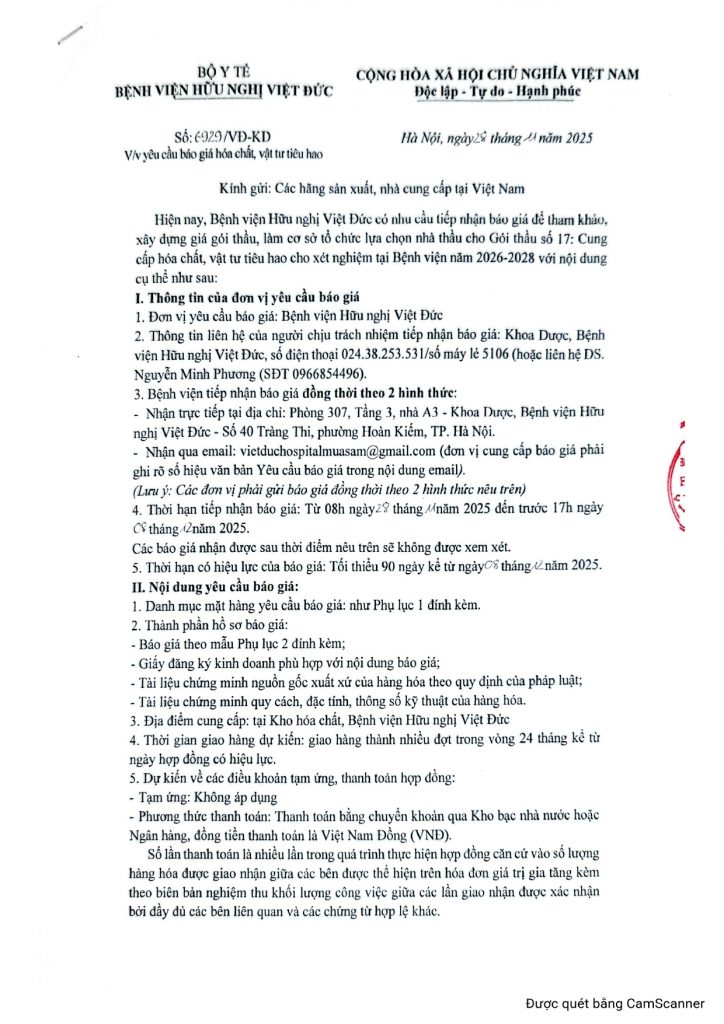 Hiện nay, Bệnh viện Hữu nghị Việt Đức đang có nhu cầu mua sắm Gói thầu số 17: Cung cấp hóa chất, vật tư tiêu hao cho xét nghiệm tại Bệnh viện năm 2026-2028. Để có cơ sở thực hiện mua sắm, Bệnh viện Hữu nghị Việt Đức mời các đơn vị, doanh nghiệp có khả năng cung cấp chào giá, chi tiết theo công văn Yêu cầu báo giá được đăng tải này.