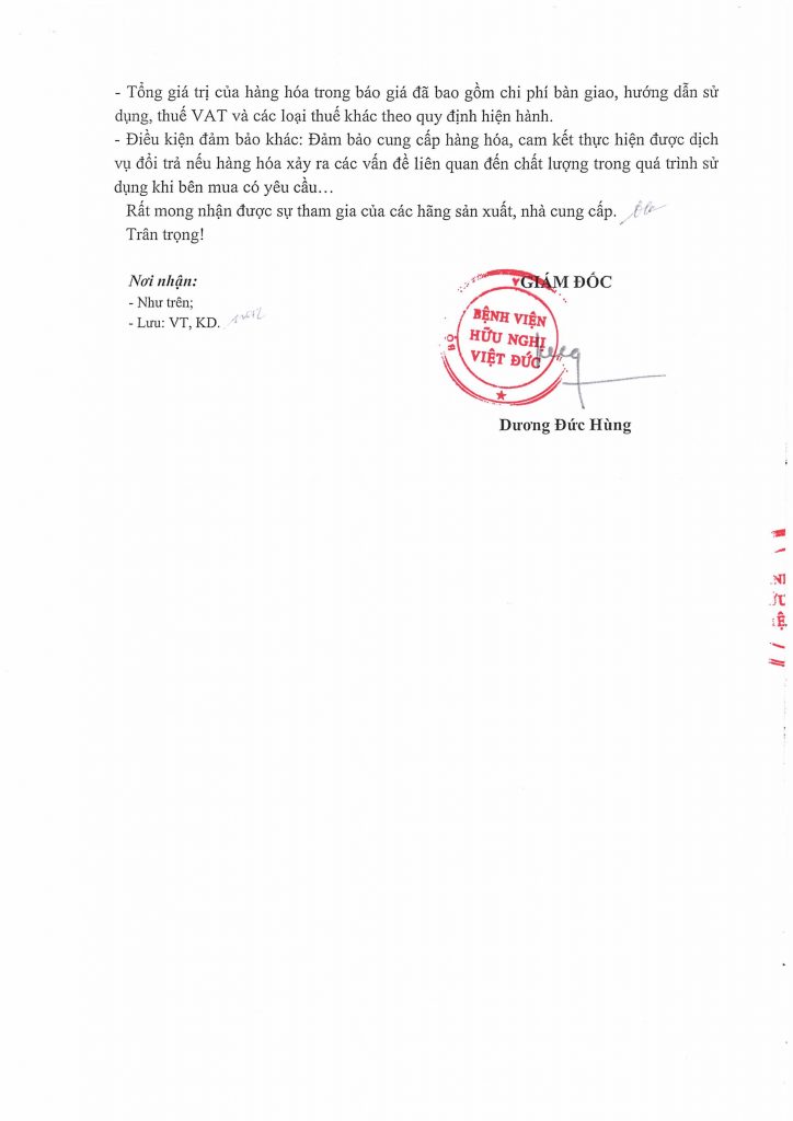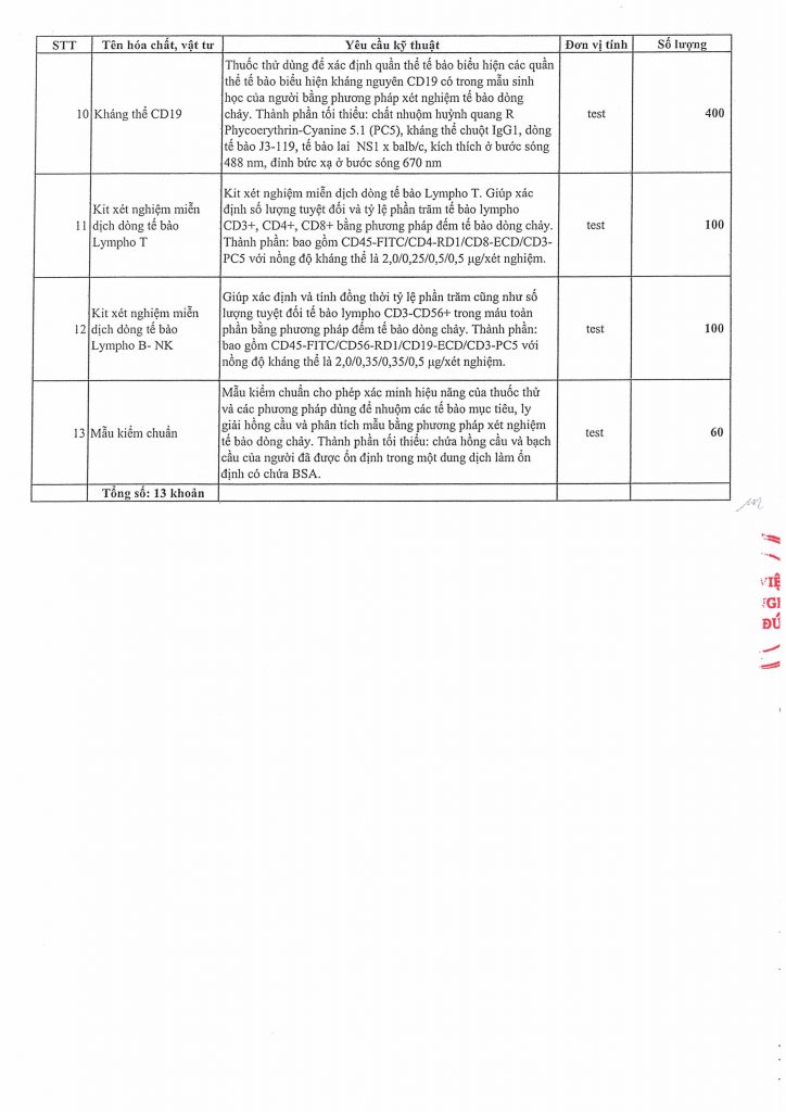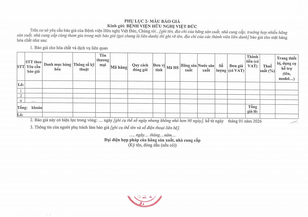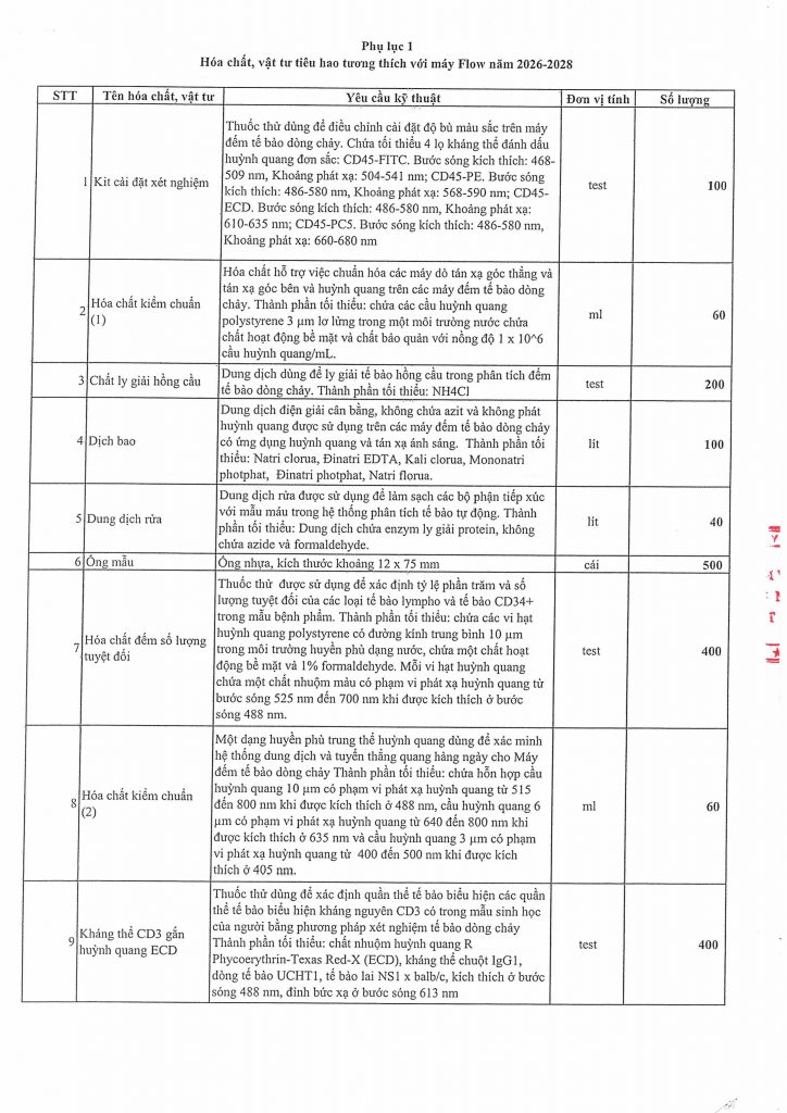 Hiện nay, Bệnh viện Hữu nghị Việt Đức đang có nhu cầu mua sắm hóa chất, vật tư tiêu hao tương thích với máy Flow năm 2026-2028. Để có cơ sở thực hiện mua sắm, Bệnh viện Hữu nghị Việt Đức mời các đơn vị, doanh nghiệp có khả năng cung cấp chào giá, chi tiết theo công văn Yêu cầu báo giá được đăng tải này.
