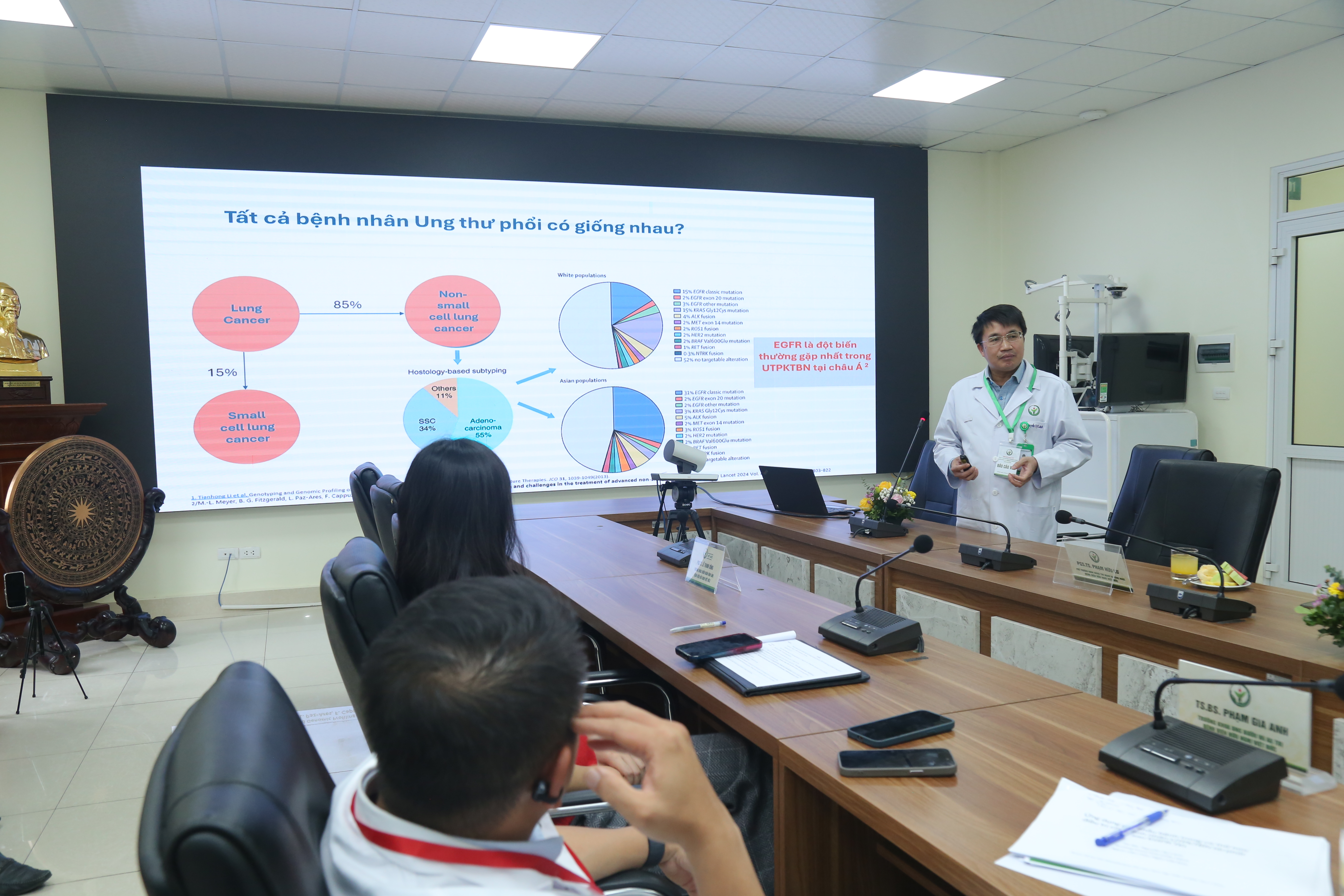 Tại hội thảo, các báo cáo tập trung làm rõ vai trò của đột biến EGFR, giải phẫu bệnh và tiếp cận đa chuyên khoa trong tối ưu hóa điều trị gồm chuyên đề của BSCKII Võ Thị Huyền Trang – Khoa Ung bướu & Xạ trị trình bày Chiến lược điều trị UTPKTBN giai đoạn IV có đột biến EGFR; TS.BS Nguyễn Sỹ Lánh – Trưởng khoa Giải phẫu bệnh phân tích Ứng dụng giải phẫu bệnh trong cá thể hóa điều trị bệnh nhân tái phát sau EGFR TKI; BS Thái Thanh Xuân chia sẻ ca lâm sàng điển hình giai đoạn IV.