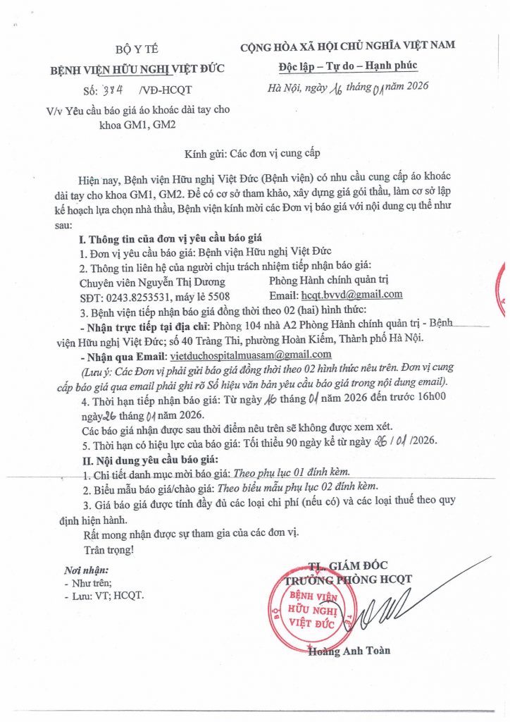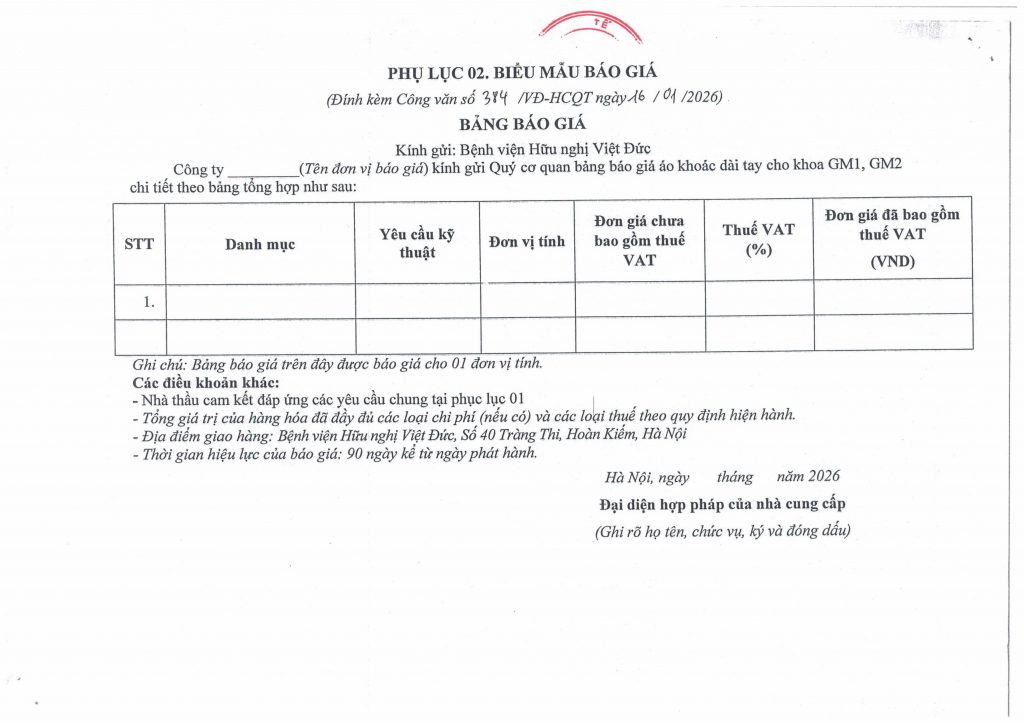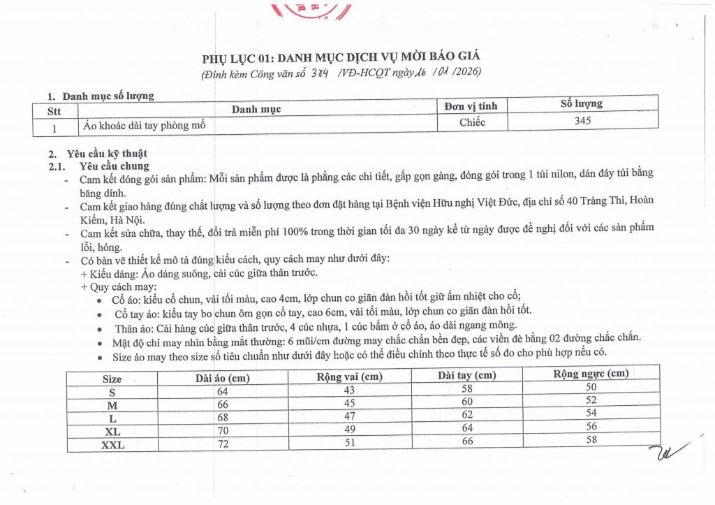 Hiện nay, Bệnh viện Hữu nghị Việt Đức (Bệnh viện) có nhu cầu cung cấp áo khoác dài tay cho khoa GM1, GM2. Để có cơ sở tham khảo, xây dựng giá gói thầu, làm cơ sở lập kế hoạch lựa chọn nhà thầu, Bệnh viện kính mời các Đơn vị báo giá với nội dung cụ thể như sau: