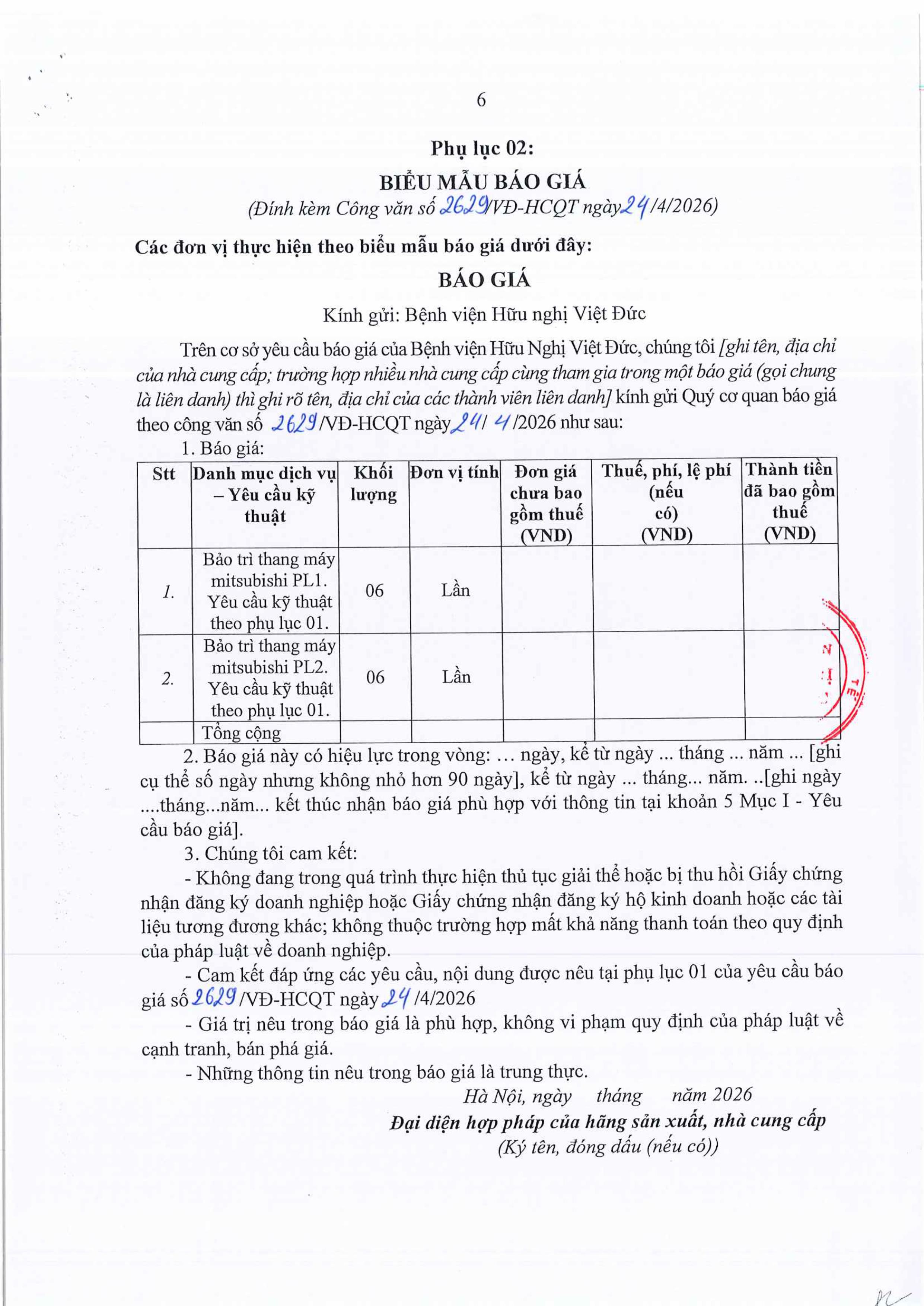 Hiện nay, Bệnh viện Hữu nghị Việt Đức có nhu cầu bảo trì 02 thang máy, để có cơ sở tham khảo giá, Bệnh viện Hữu nghị Việt Đức kính mời các đơn vị có khả năng cung cấp, báo giá dịch vụ với nội dung cụ thể như sau: