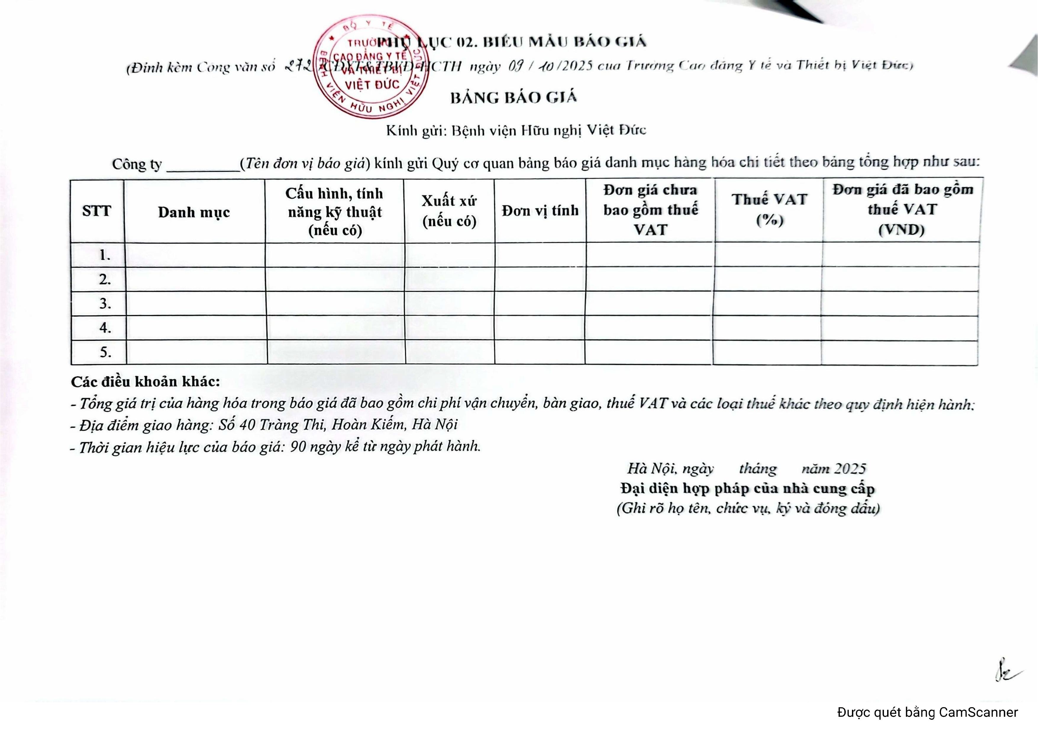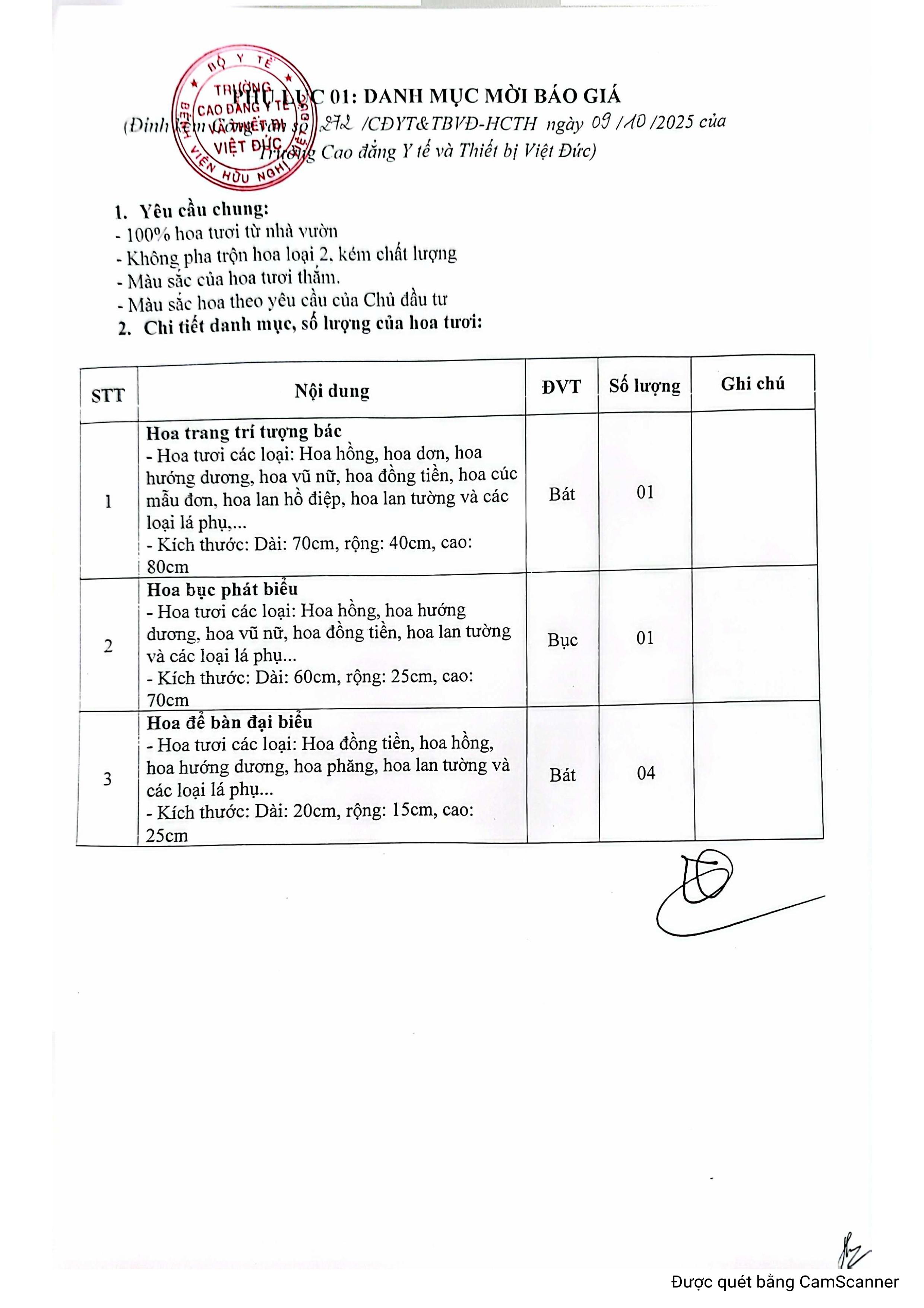 Hiện nay, Bệnh viện Hữu nghị Việt Đức có nhu tiếp nhận báo giá lựa chọn nhà cung cấp hoa tươi phục vụ Lễ Khai giảng năm học 2025-2026 của Trường Cao đẳng Y tế và Thiết bị Việt Đức với nội dung cụ thể như sau: