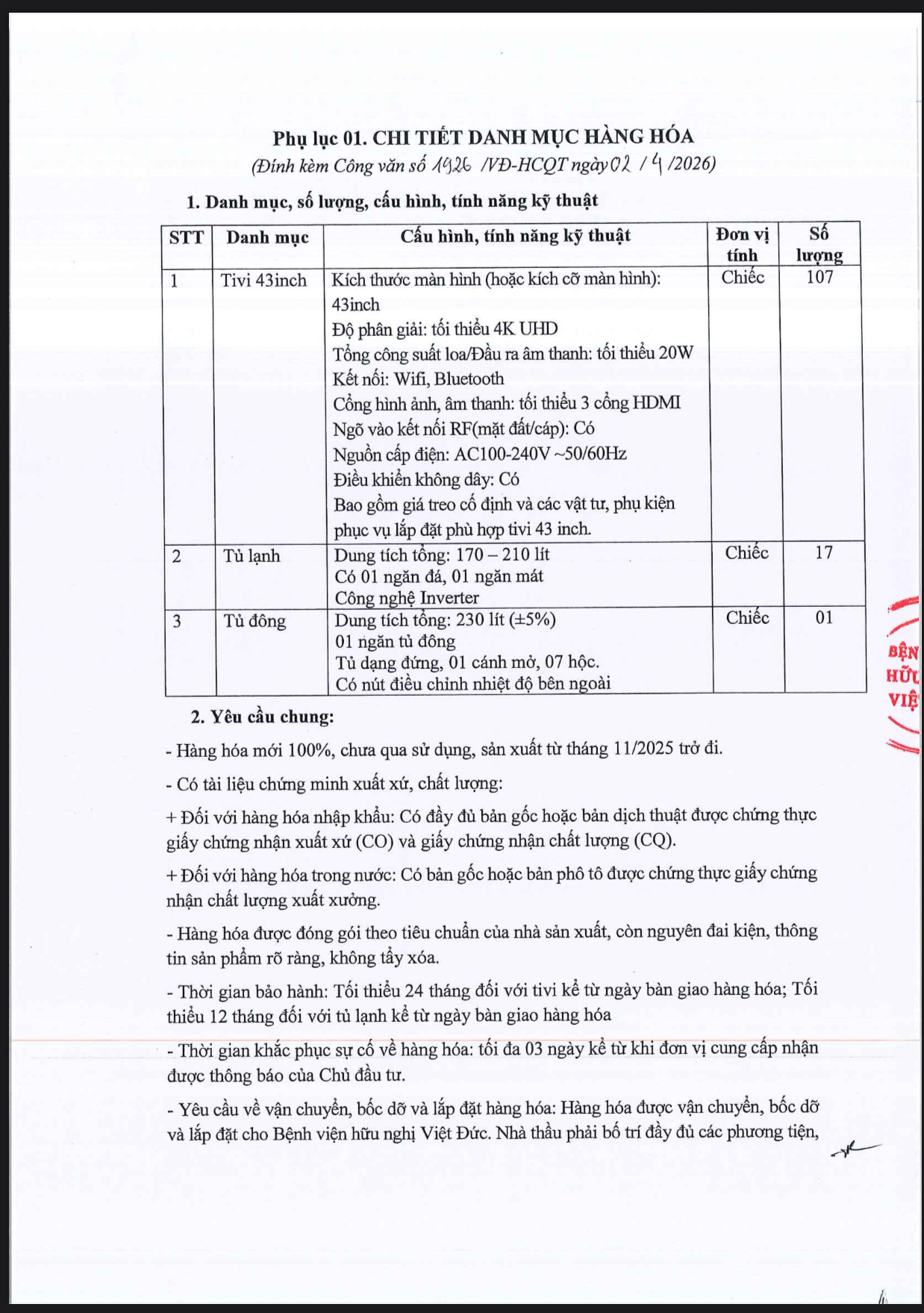 Bệnh viện Hữu nghị Việt Đức có nhu cầu báo giá cung cấp tivi, tủ lạnh cho Bệnh viện