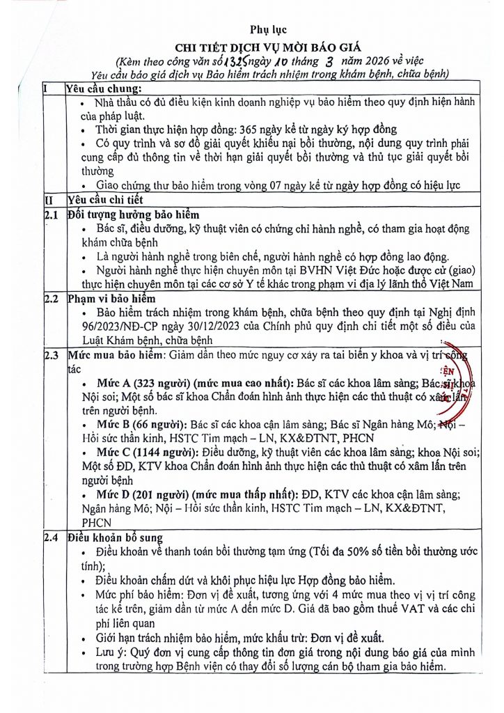 Hiện nay, Bệnh viện Hữu nghị Việt Đức có nhu cầu tiếp nhận báo giá để tham khảo, xây dựng giá gói thầu, làm cơ sở tổ chức lựa chọn nhà thầu cho gói thầu “Dịch vụ bảo hiểm trách nhiệm trong khám bệnh, chữa bệnh năm 2026” với nội dung cụ thể như sau: