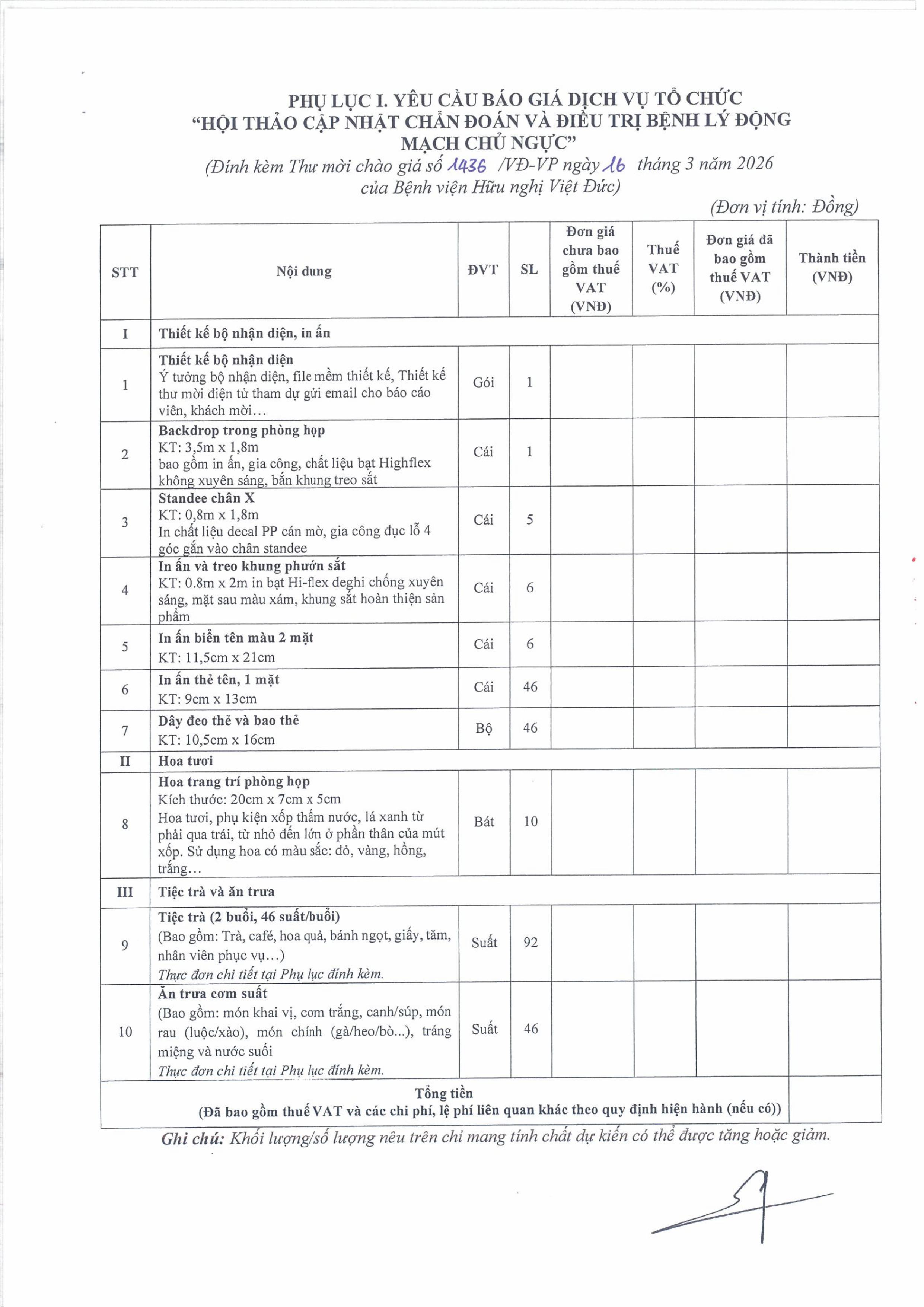 Bệnh viện Hữu nghị Việt Đức có nhu cầu tiếp nhận báo giá để cung cấp dịch vụ tổ chức Hội thảo “Cập nhật chẩn đoán và điều trị bệnh lý động mạch chủ ngực” tổ chức tại Bệnh viện Hữu nghị Việt Đức, với nội dung cụ thể như sau: