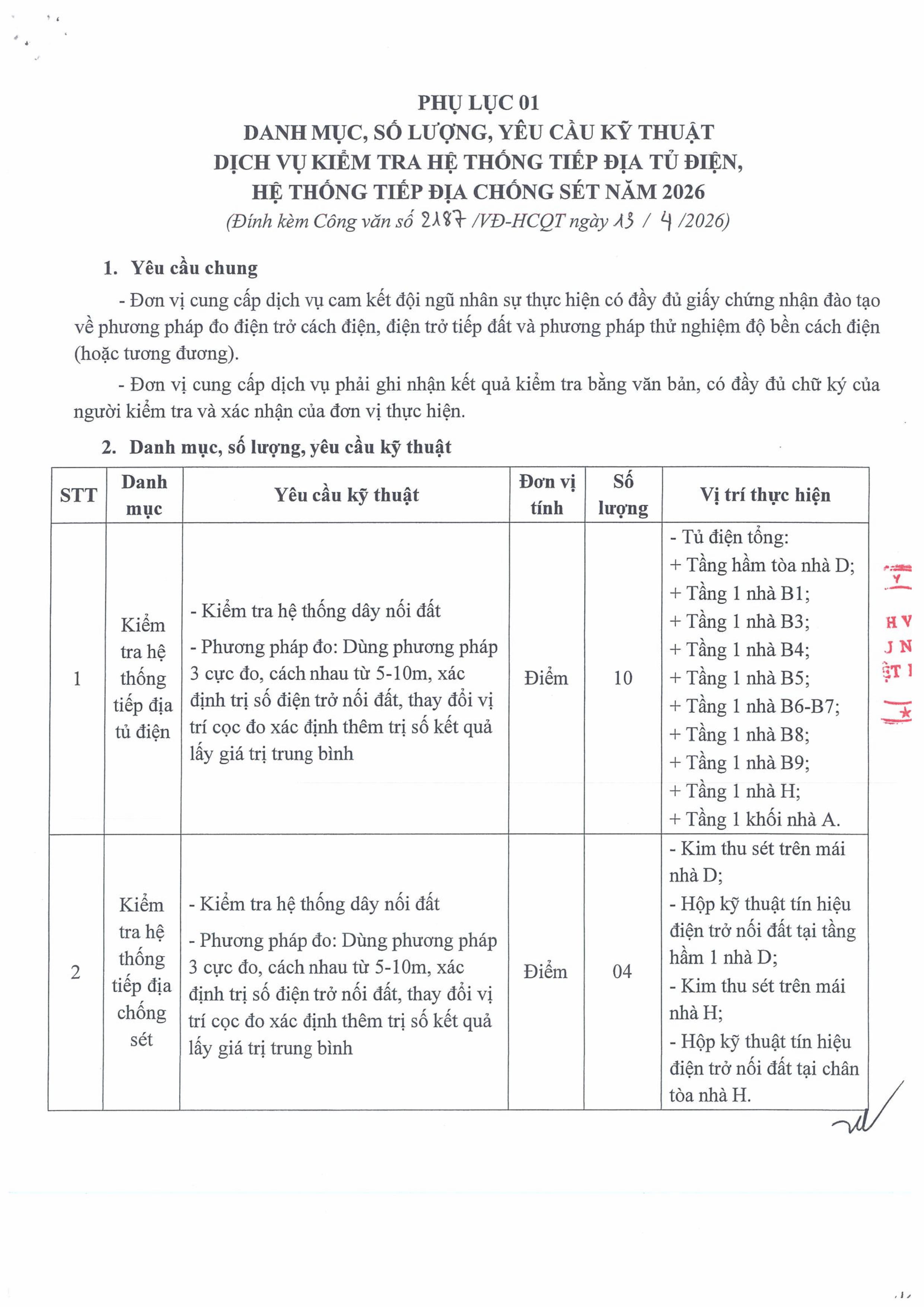 Bệnh viện Hữu nghị Việt Đức có nhu cầu báo giá dịch vụ kiểm tra hệ thống tiếp địa tủ điện, hệ thống tiếp địa chống sét