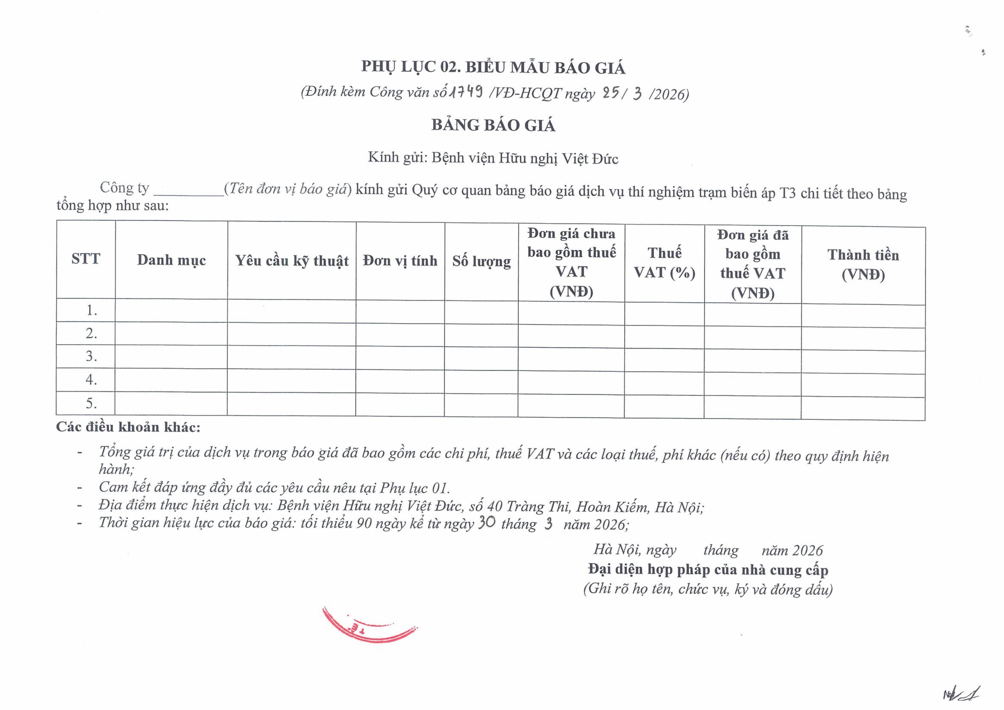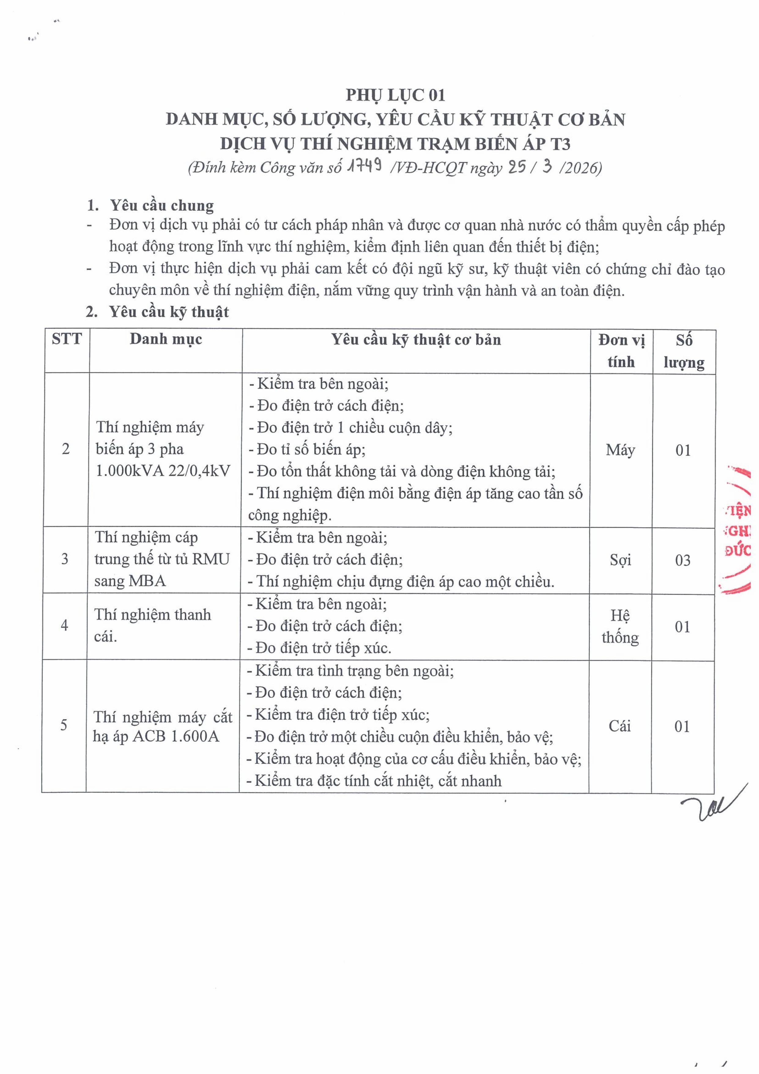 Hiện nay, Bệnh viện Hữu nghị Việt Đức có nhu cầu thí nghiệm trạm biến áp T3. Để có cơ sở tham khảo giá dịch vụ thí nghiệm trạm biến áp trên thị trường, Bệnh viện Hữu nghị Việt Đức kính mời các đơn vị có khả năng cung cấp dịch vụ trên tham gia báo giá với nội dung cụ thể như sau: