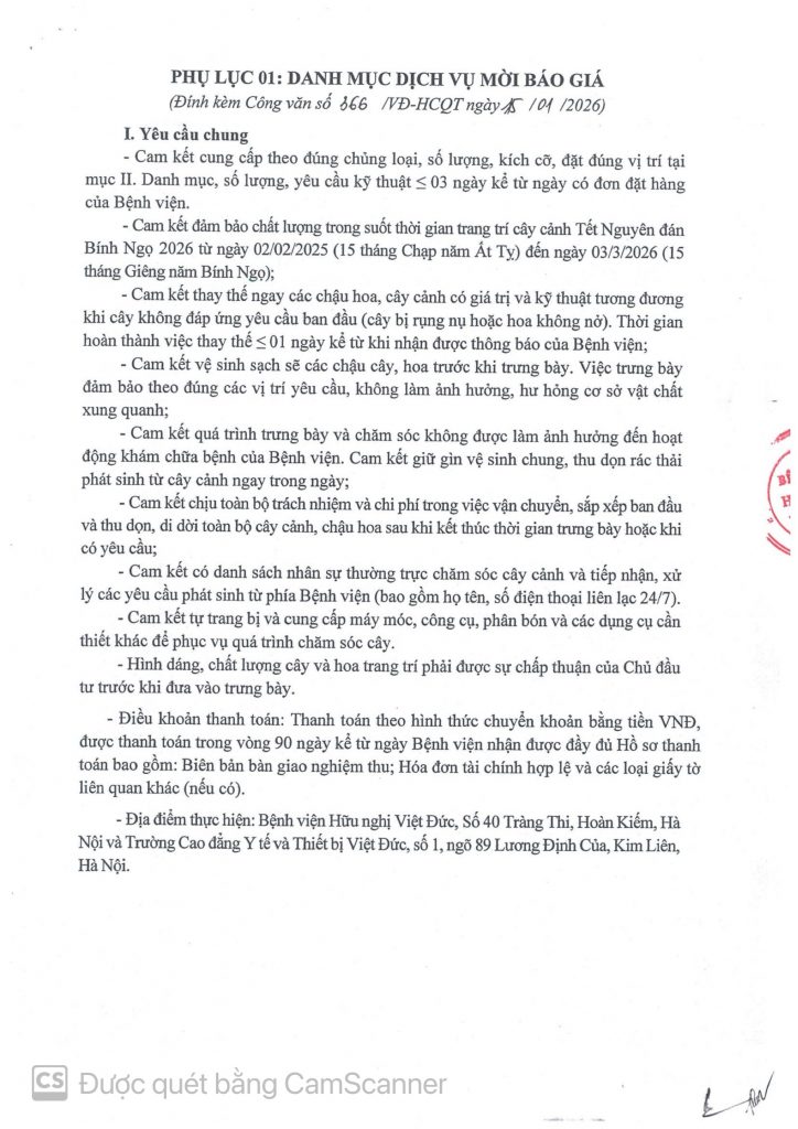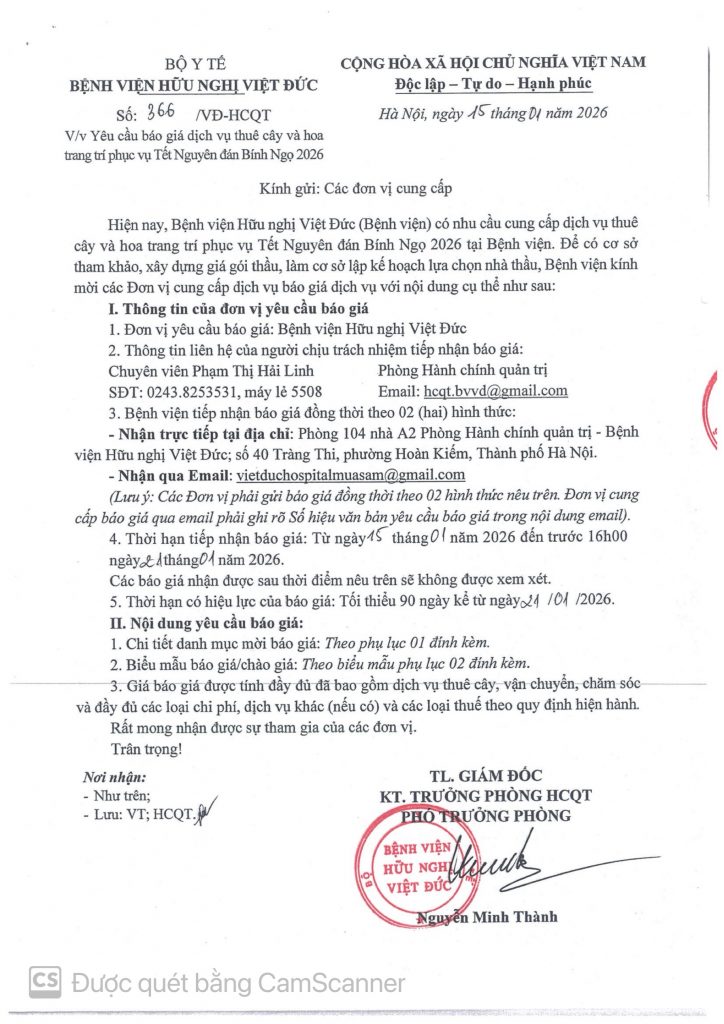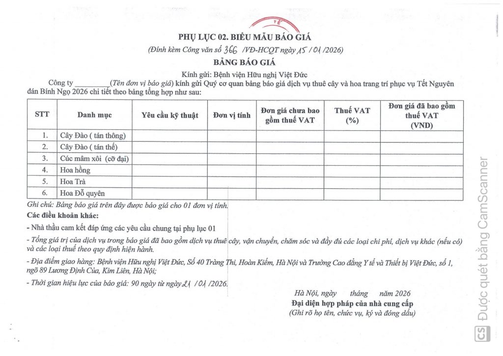 Hiện nay, Bệnh viện Hữu nghị Việt Đức (Bệnh viện) có nhu cầu cung cấp dịch vụ thuê cây và hoa trang trí phục vụ Tết Nguyên đán Bính Ngọ 2026 tại Bệnh viện. Để có cơ sở tham khảo, xây dựng giá gói thầu, làm cơ sở lập kế hoạch lựa chọn nhà thầu, Bệnh viện kính mời các Đơn vị cung cấp dịch vụ báo giá dịch vụ với nội dung cụ thể như sau: