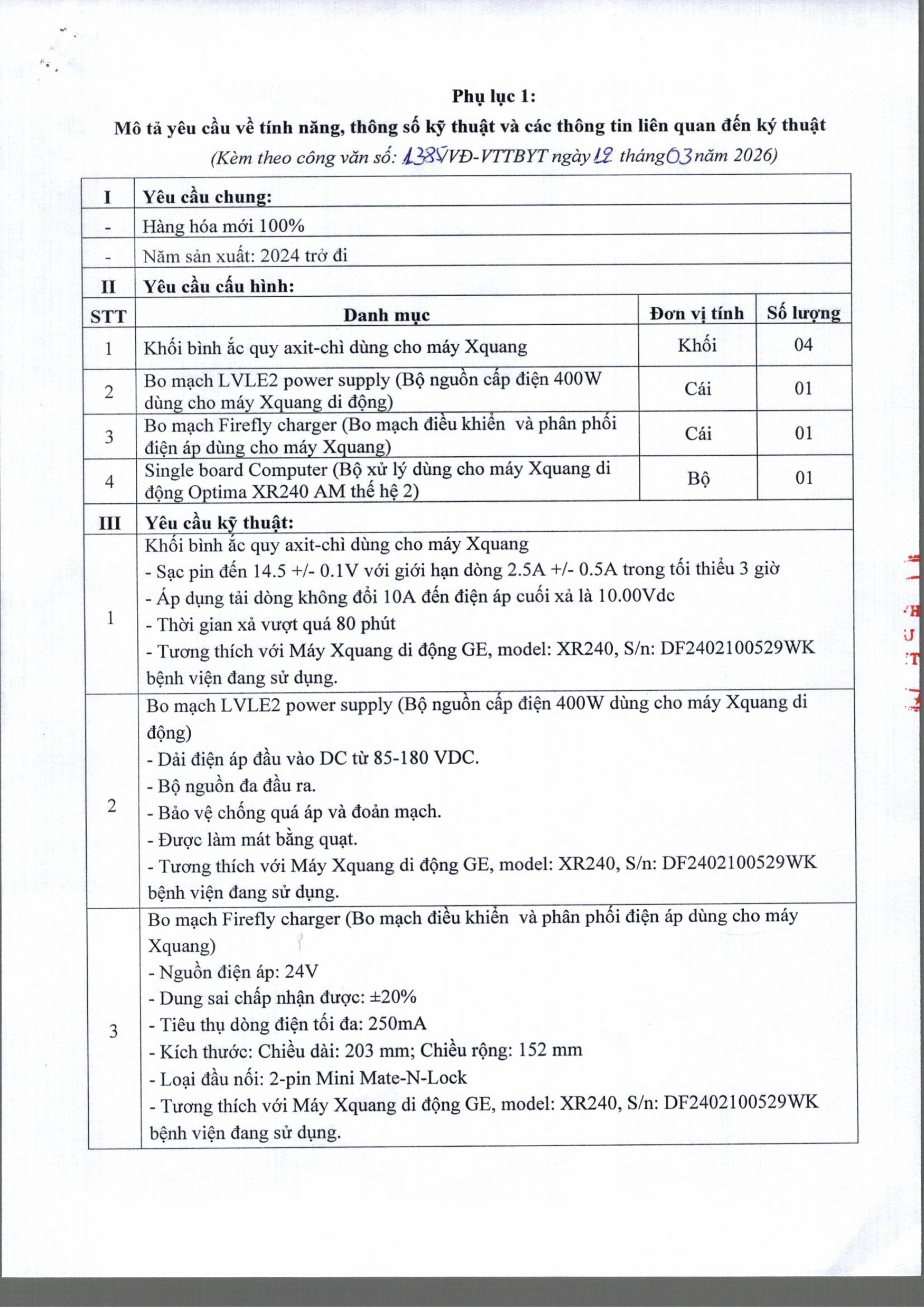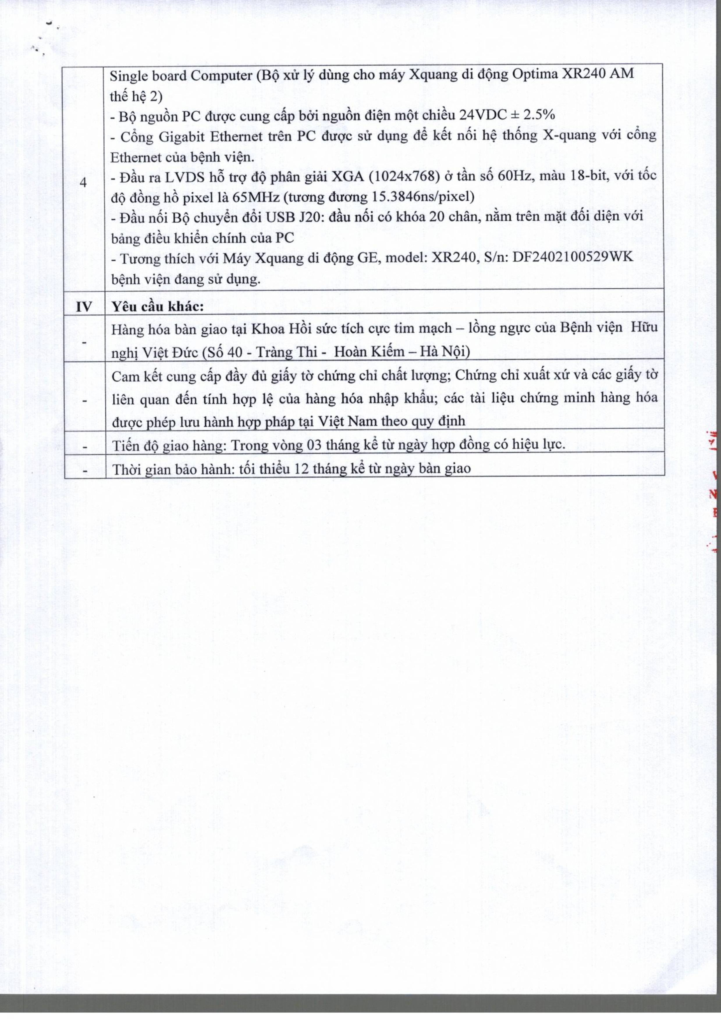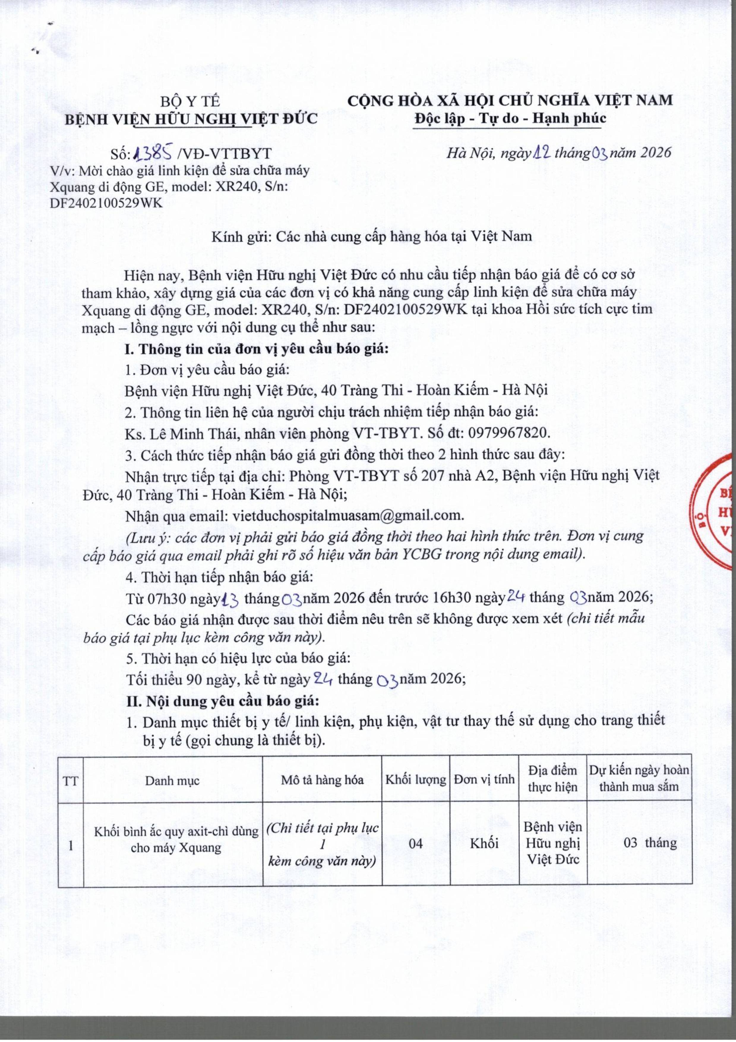 Bệnh viện Hữu nghị Việt Đức có nhu cầu tiếp nhận báo giá để có cơ sở tham khảo, xây dựng giá của các đơn vị có khả năng cung cấp linh kiện để sửa chữa máy Xquang di động GE, model: XR240, S/n: DF2402100529WK tại khoa Hồi sức tích cực tim mạch – lồng ngực với nội dung cụ thể như sau: