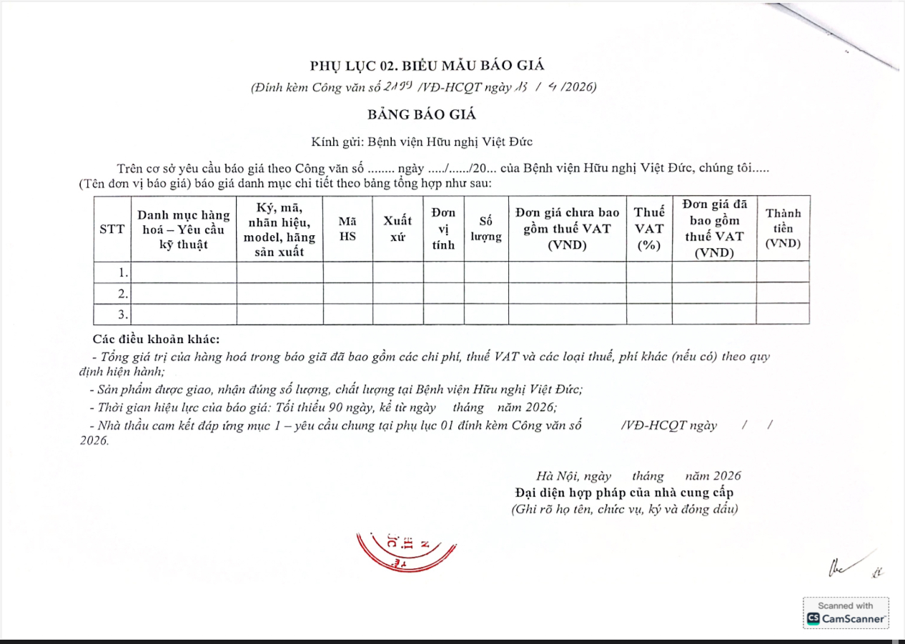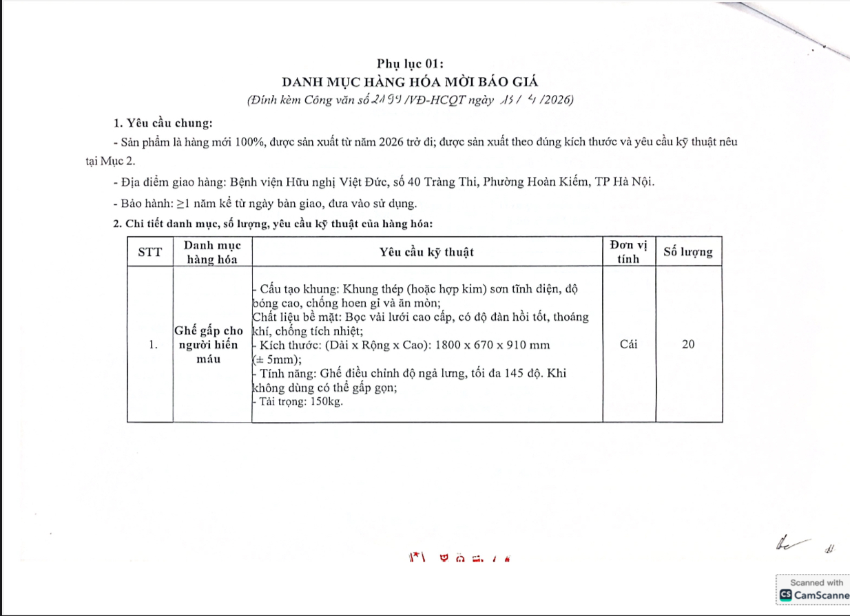 Hiện nay, Bệnh viện Hữu nghị Việt Đức có nhu cầu tiếp nhận báo giá để tham khảo, xây dựng giá gói thầu, làm cơ sở tổ chức lựa chọn nhà thầu cho gói thầu mua sắm ghế gấp cho người hiến máu phục vụ cho công tác lấy máu nhân đạo của Trung tâm Truyền máu với nội dung cụ thể như sau: