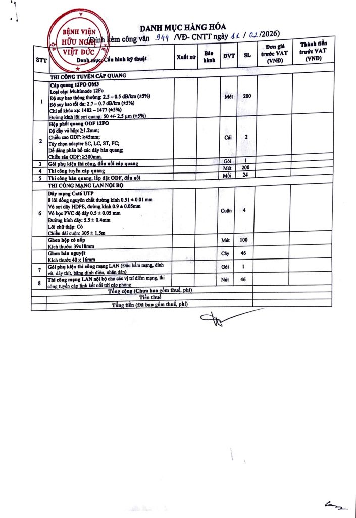 Bệnh viện Hữu nghị Việt Đức có nhu cầu báo giá mua sắm, lắp đặt mạng cáp quang tới tầng 7 nhà H, đi dây mạng LAN cho các vị trí sử dụng máy tính của phòng TCCB, QLCL, CNTT