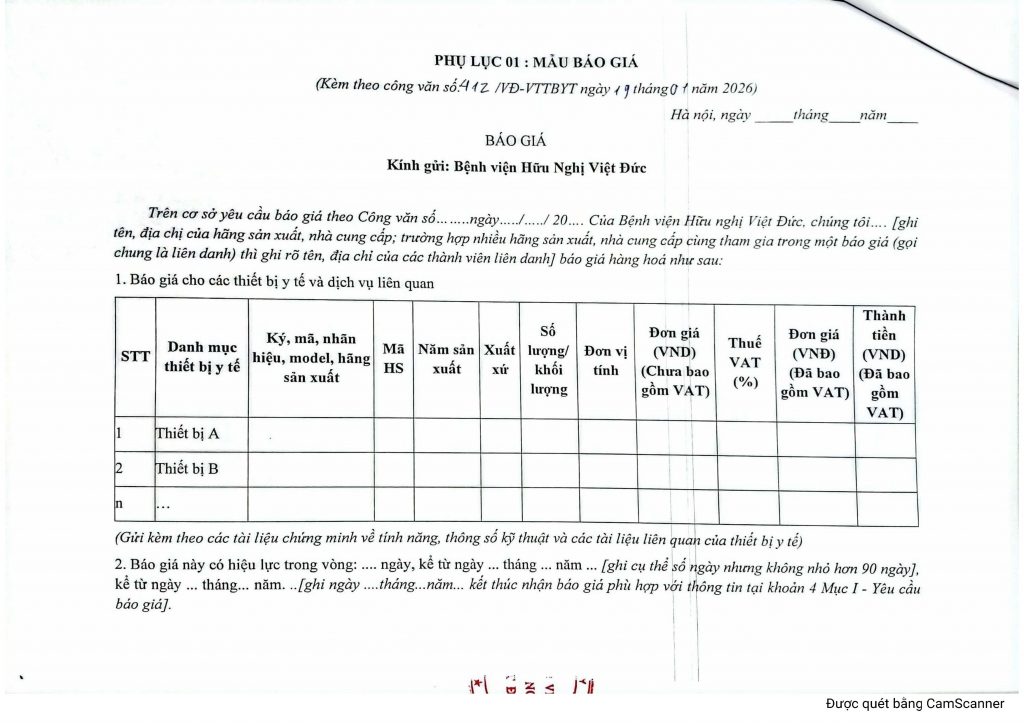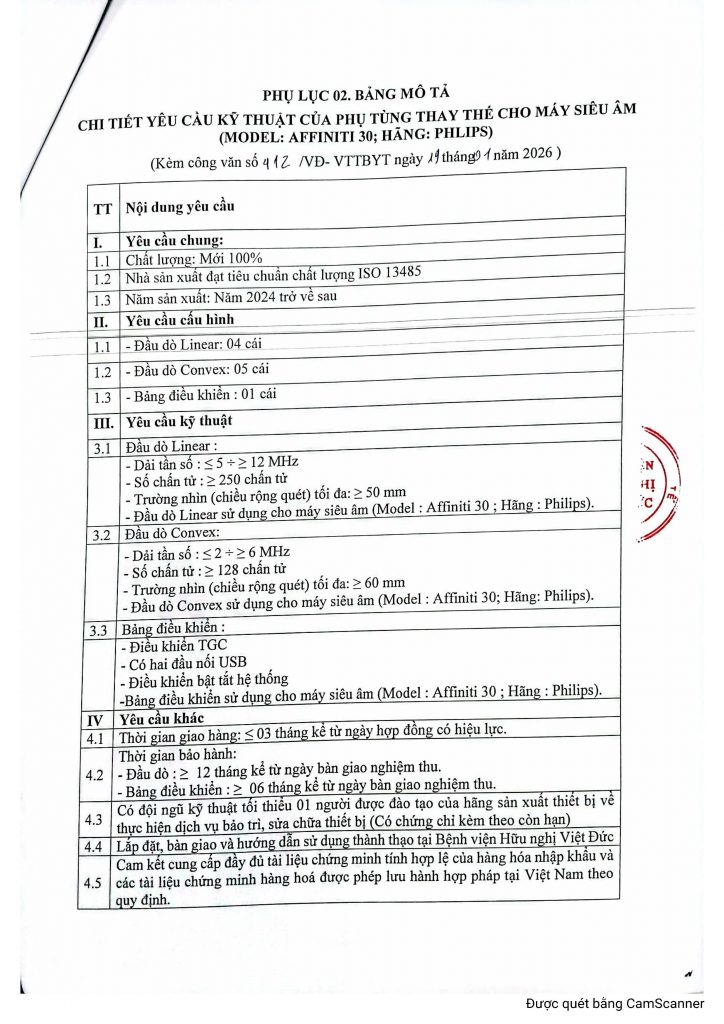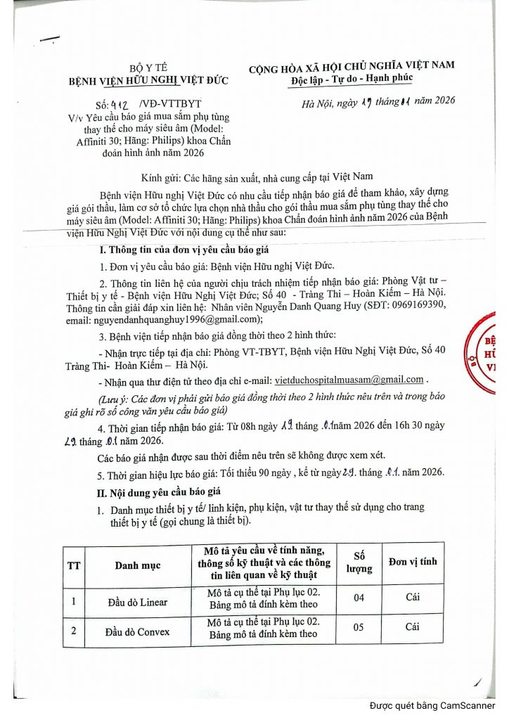 Bệnh viện Hữu nghị Việt Đức có nhu cầu tiếp nhận báo giá để tham khảo, xây dựng giá gói thầu, làm cơ sở tổ chức lựa chọn nhà thầu cho gói thầu mua sắm phụ tùng thay thế cho máy siêu âm (Model: Affiniti 30; Hãng: Philips) khoa Chẩn đoán hình ảnh năm 2026 của Bệnh viện Hữu Nghị Việt Đức với nội dung cụ thể như sau: