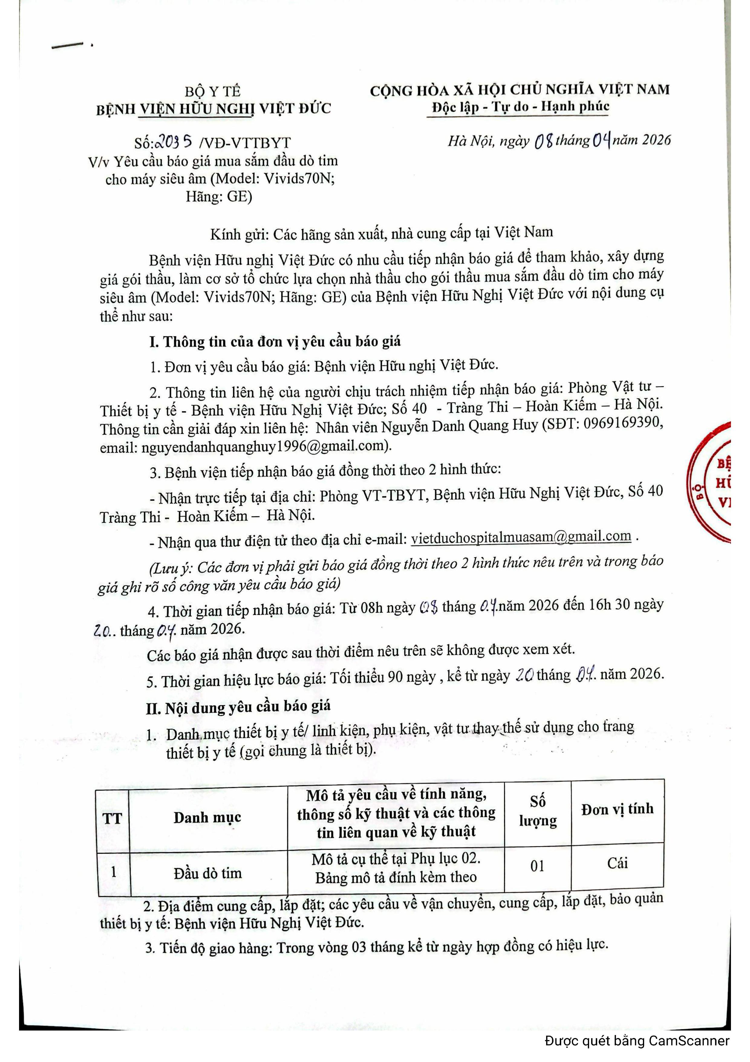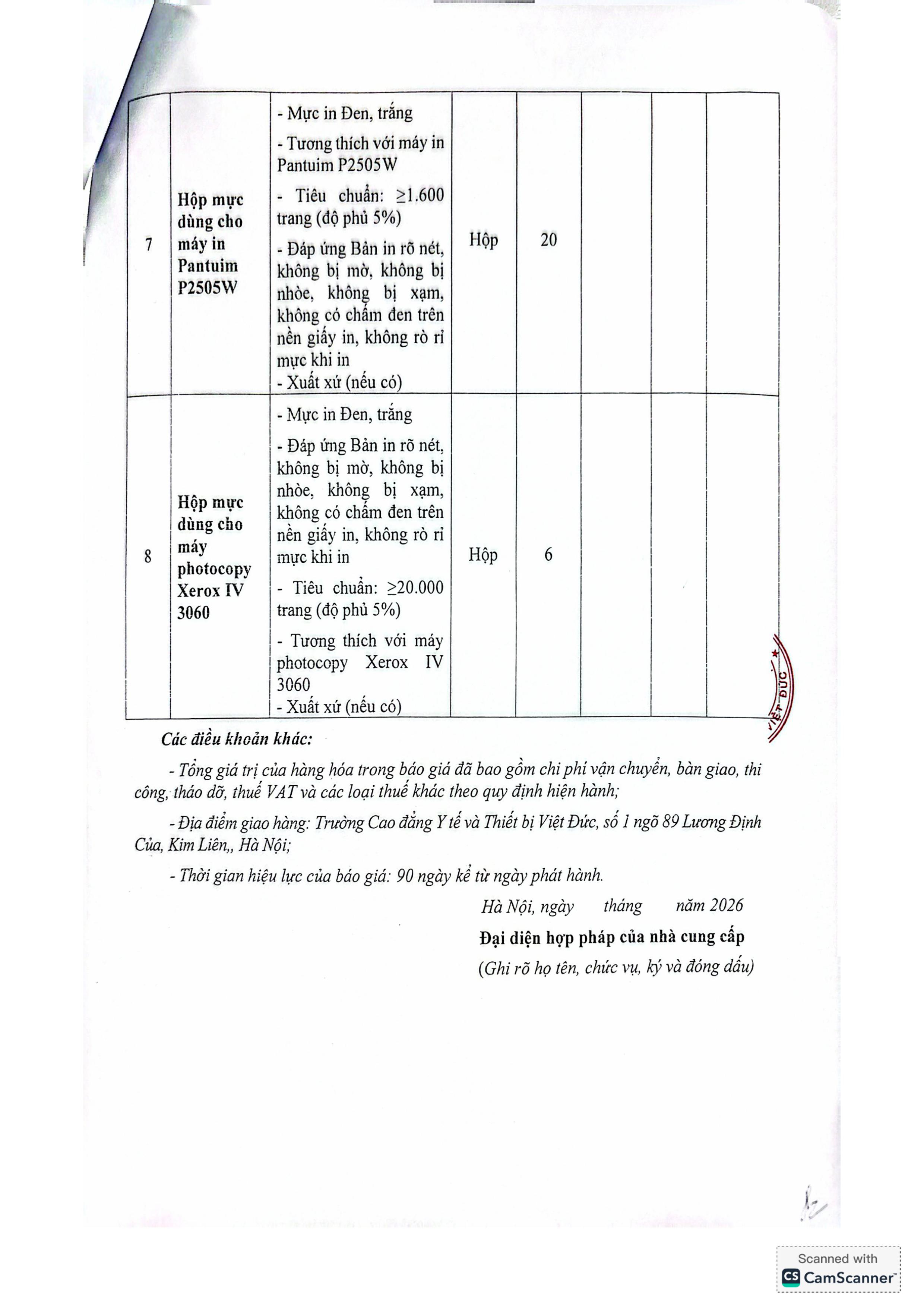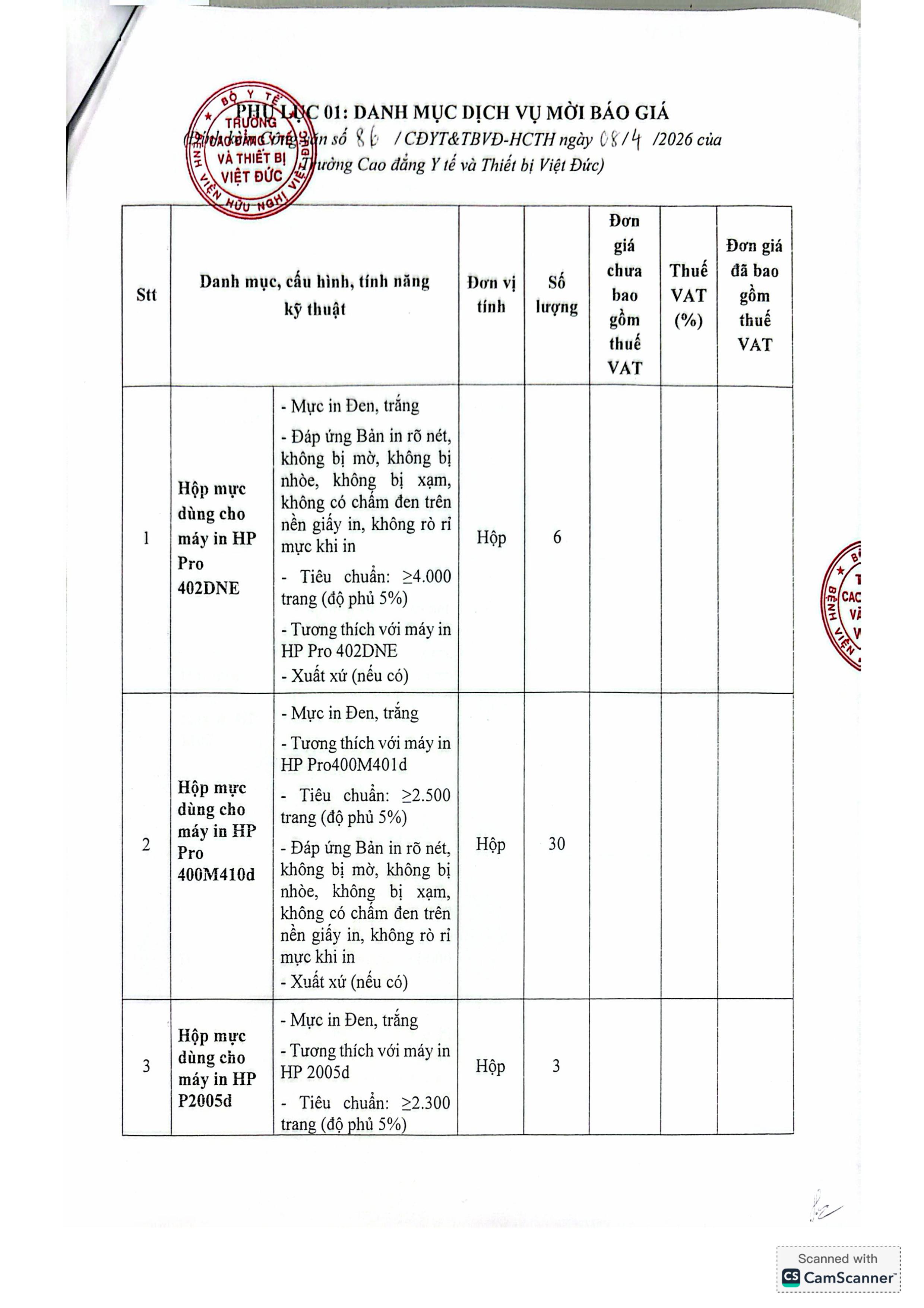 Hiện nay, Bệnh viện Hữu nghị Việt Đức có nhu cầu Mua sắm mực in cho Trường Cao đẳng Y tế và Việt Đức dùng trong năm 2026. Để có cơ sở tham khảo giá các hàng hóa trên thị trường, Bệnh viện Hữu nghị Việt Đức kính mời các Đơn vị có khả năng cung cấp tham gia chào giá, chi tiết cụ thể như sau: