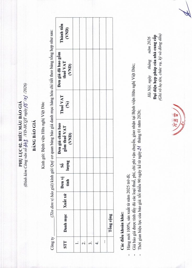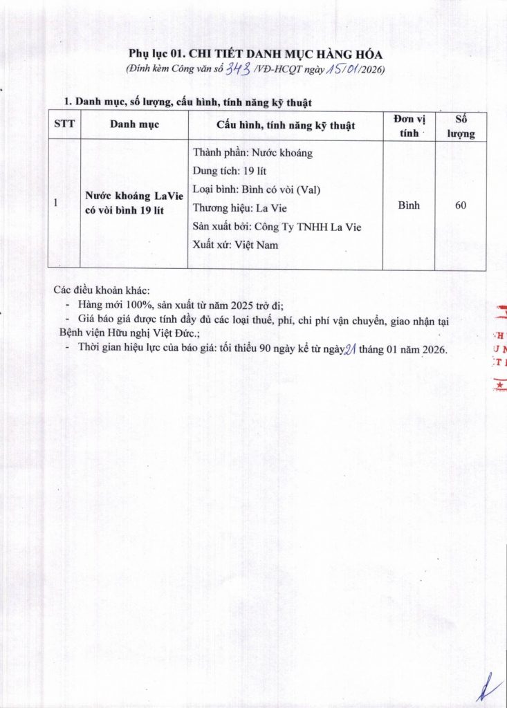Hiện nay, Bệnh viện Hữu nghị Việt Đức có nhu cầu mua nước khoáng LaVie có vòi bình 19 lít phục vụ đào tạo, triển khai phần mềm ISOFH. Để có cơ sở tham khảo giá mặt hàng nước khoáng LaVie có vòi bình 19 lít trên thị trường, Bệnh viện Hữu nghị Việt Đức kính mời các đơn vị có khả năng cung cấp báo giá mặt hàng trên với nội dung cụ thể như sau: