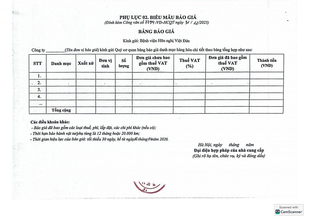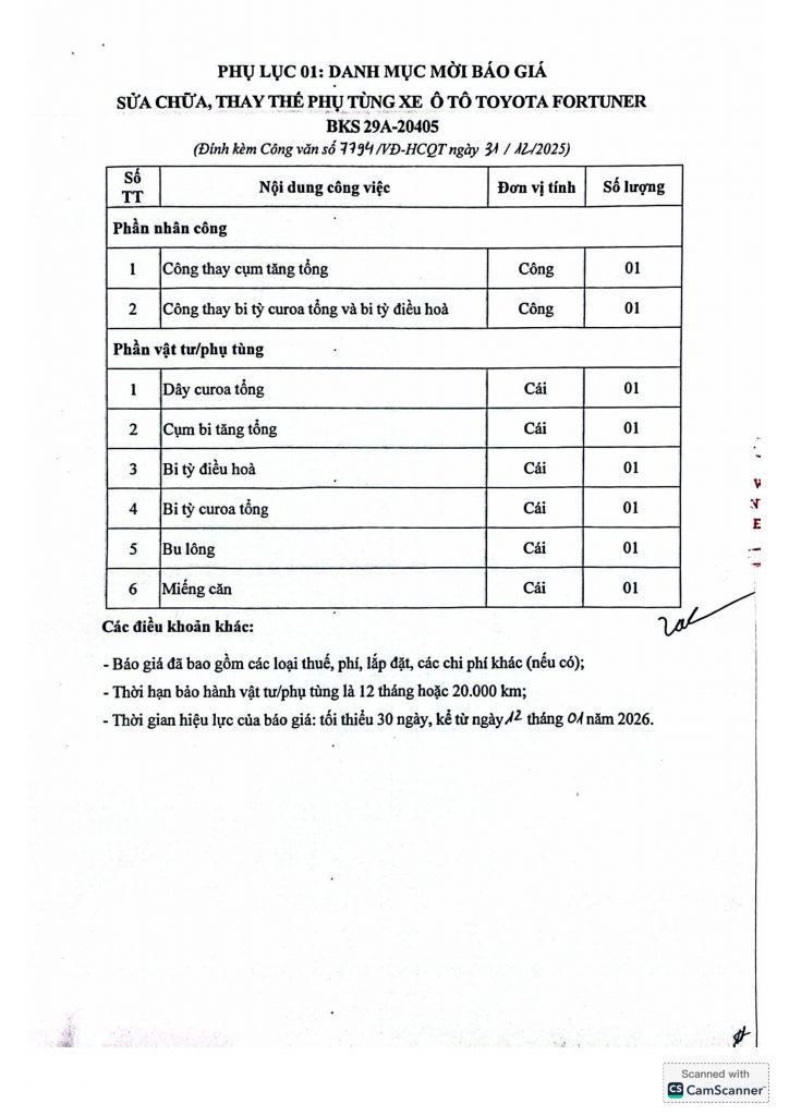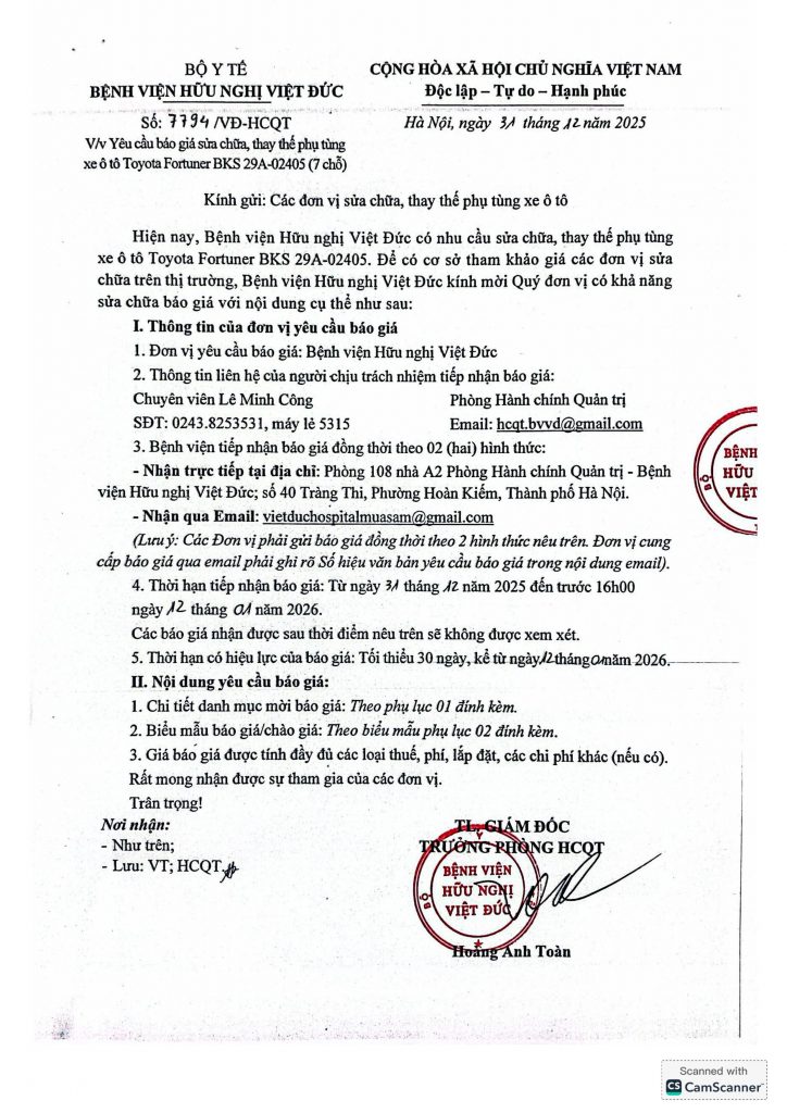 Hiện nay, Bệnh viện Hữu nghị Việt Đức có nhu cầu sửa chữa, thay thế phụ tùng xe ô tô Toyota Fortuner BKS 29A-02405. Để có cơ sở tham khảo giá các đơn vị sửa chữa trên thị trường, Bệnh viện Hữu nghị Việt Đức kính mời Quý đơn vị có khả năng sửa chữa báo giá với nội dung cụ thể như sau: