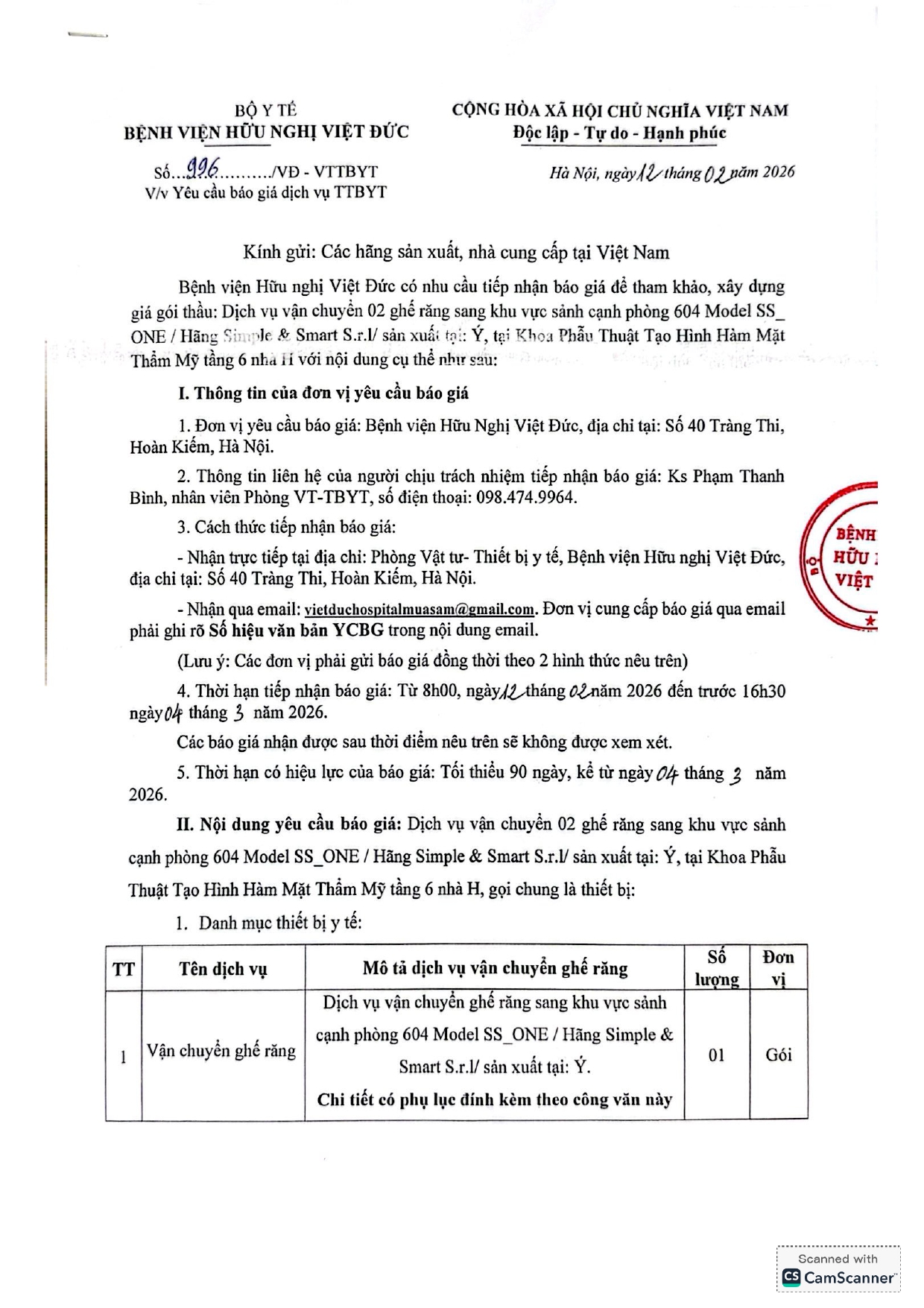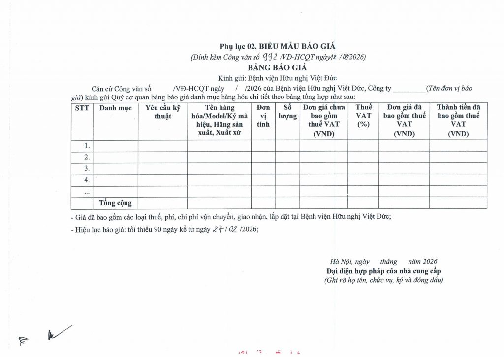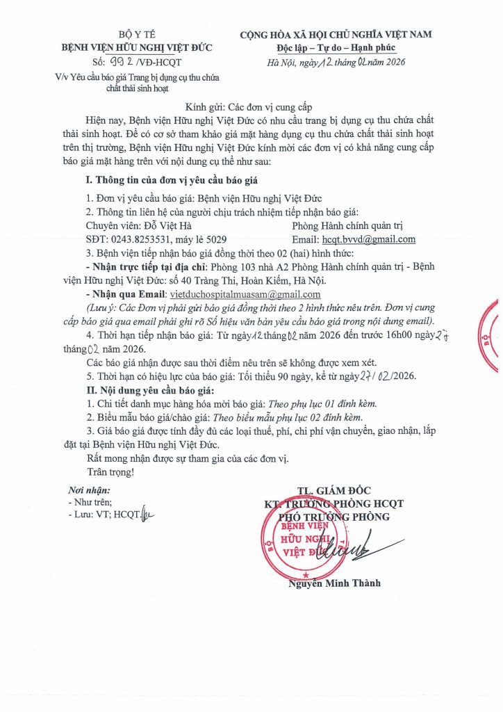 Bệnh viện Hữu nghị Việt Đức mời chào báo giá dịch vụ TTBYT