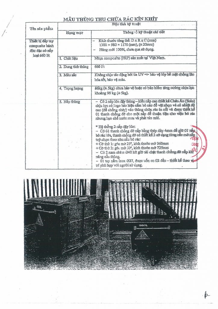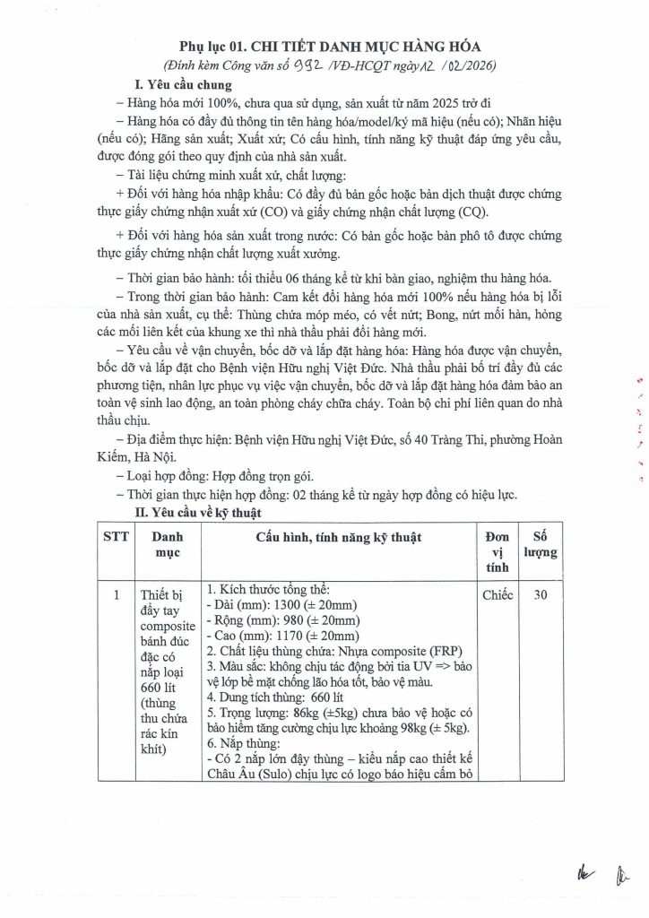 Hiện nay, Bệnh viện Hữu nghị Việt Đức có nhu cầu trang bị dụng cụ thu chứa chất thải sinh hoạt. Để có cơ sở tham khảo giá mặt hàng dụng cụ thu chứa chất thải sinh hoạt trên thị trường, Bệnh viện Hữu nghị Việt Đức kính mời các đơn vị có khả năng cung cấp báo giá mặt hàng trên với nội dung cụ thể như sau:
