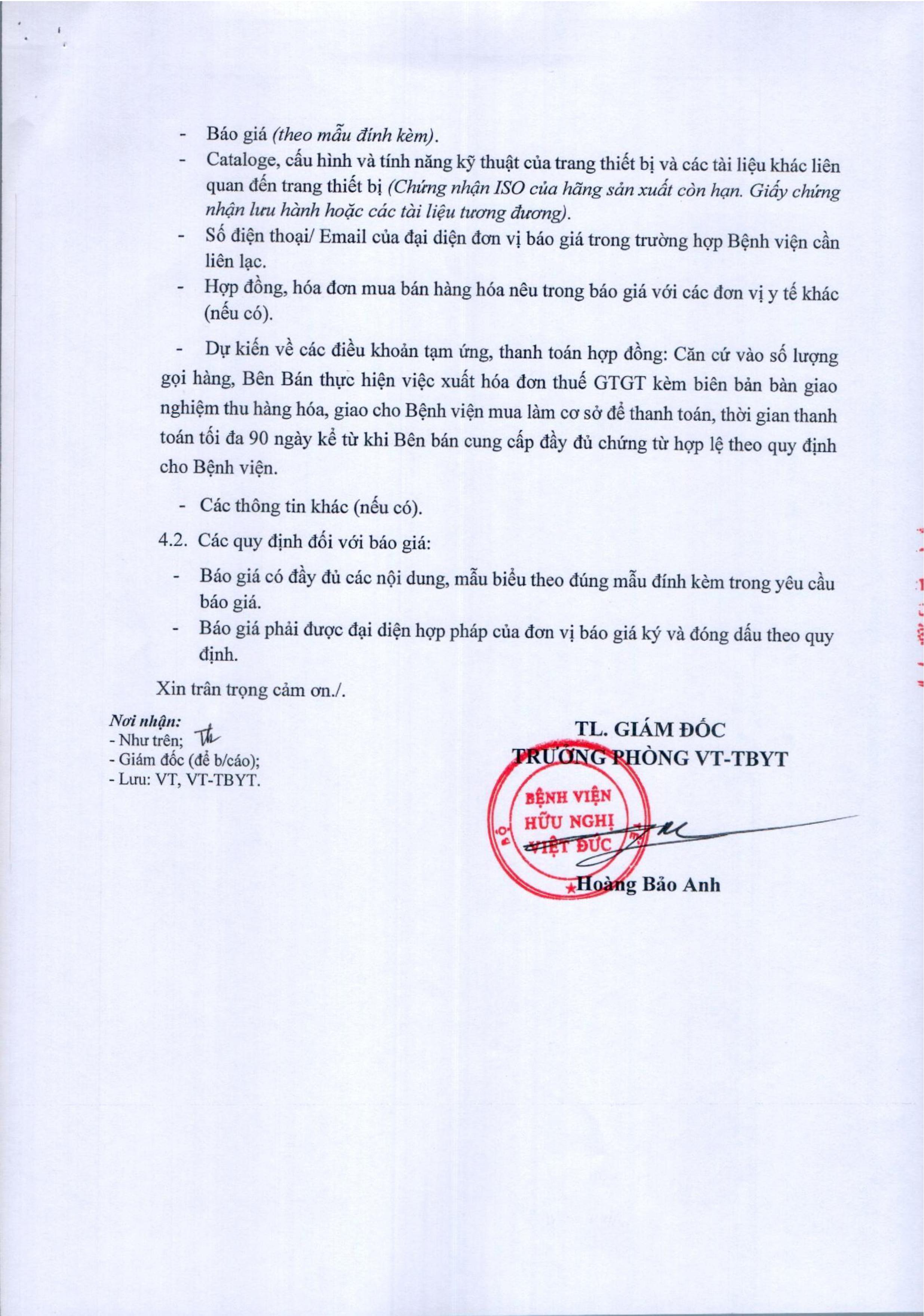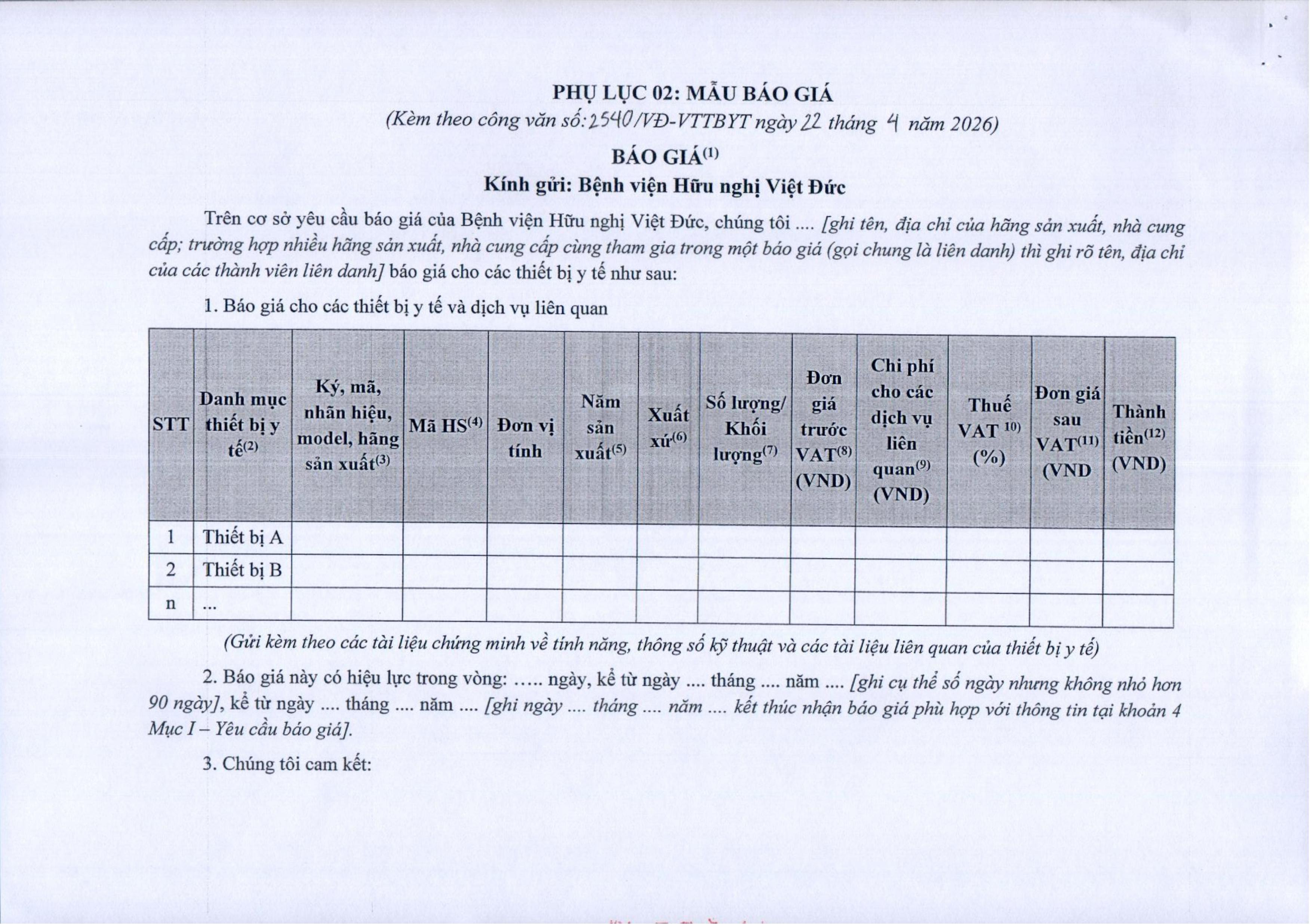 Bệnh viện Hữu nghị Việt Đức có nhu cầu báo giá TTBYT