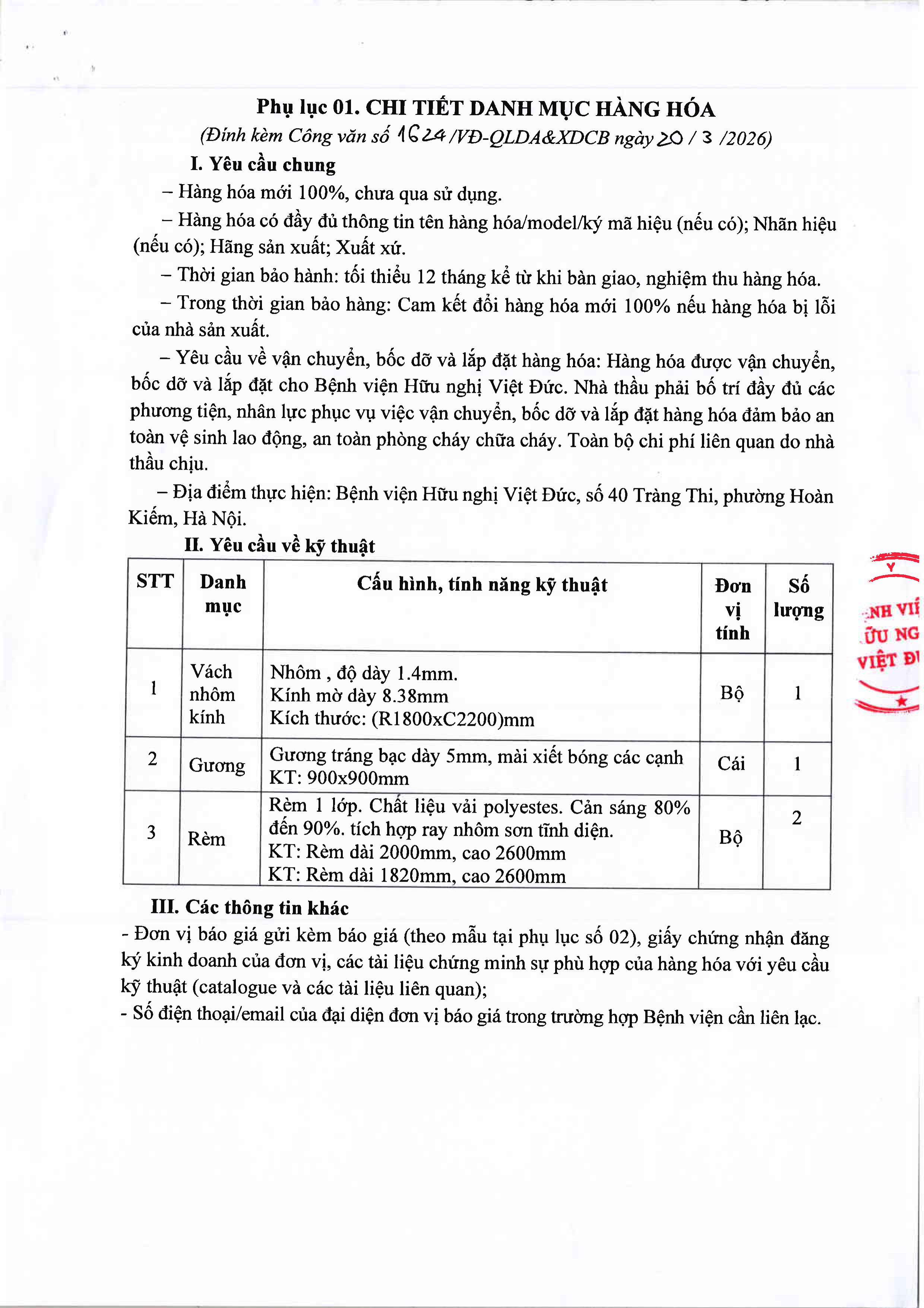 Hiện nay, Bệnh viện Hữu nghị Việt Đức có nhu cầu mua sắm Vách nhôm kính, gương, rèm quây phòng. Để có cơ sở tham khảo giá mặt hàng Vách nhôm kính, gương, rèm quây phòng. trên thị trường, Bệnh viện Hữu nghị Việt Đức kính mời các đơn vị có khả năng cung cấp báo giá các mặt hàng trên với nội dung cụ thể như sau: