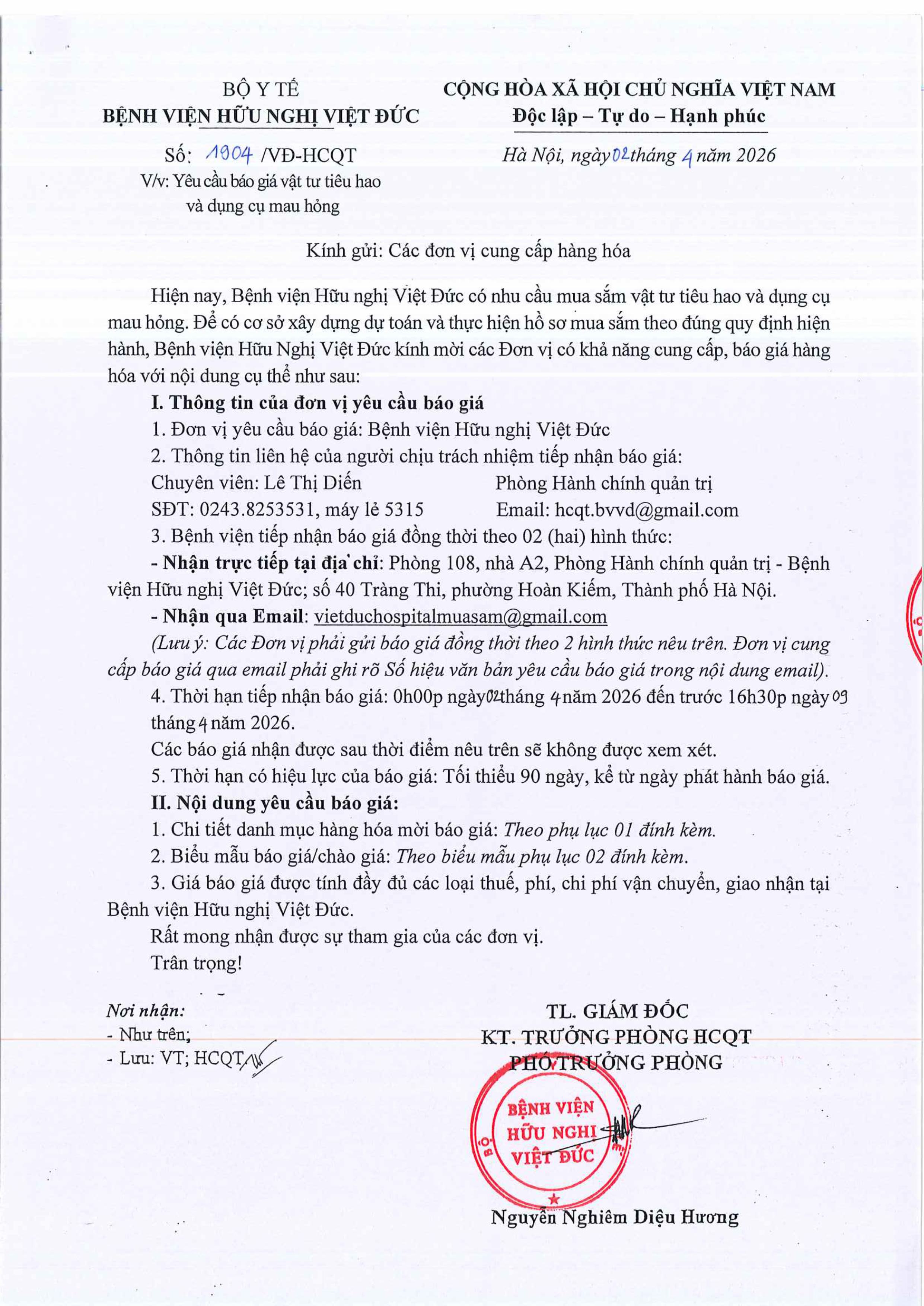 Hiện nay, Bệnh viện Hữu nghị Việt Đức có nhu cầu mua sắm vật tư tiêu hao và dụng cụ mau hỏng. Để có cơ sở xây dựng dự toán và thực hiện hồ sơ mua sắm theo đúng quy định hiện hành, Bệnh viện Hữu Nghị Việt Đức kính mời các Đơn vị có khả năng cung cấp, báo giá hàng hóa với nội dung cụ thể như sau: