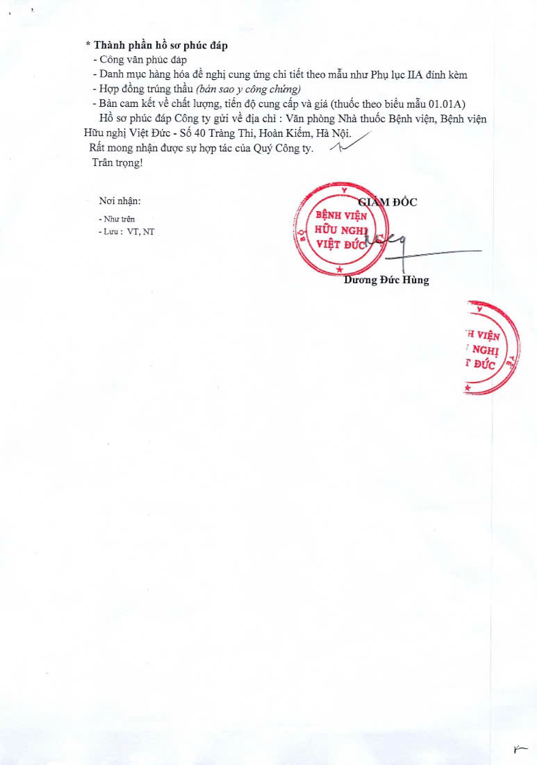 Quý Công ty đã trúng thầu và đang cung ứng cho Bệnh viện theo hợp đồng đã ký. Hiện nay, Bệnh viện Hữu nghị Việt Đức có nhu cầu mua sắm hàng hóa thuộc danh mục đã trúng thầu tại Bệnh viện phục vụ cho hoạt động Nhà thuốc Bệnh viện. Vì vậy, Bệnh viện làm công văn này đề nghị Công ty cung ứng các mặt hàng thuộc danh mục hàng hóa chi tiết theo Phụ lục IA đính kèm. Công ty phúc đáp thông tin về khả năng cung ứng hàng cho Nhà thuốc, cụ thể theo hướng dẫn tại đây
