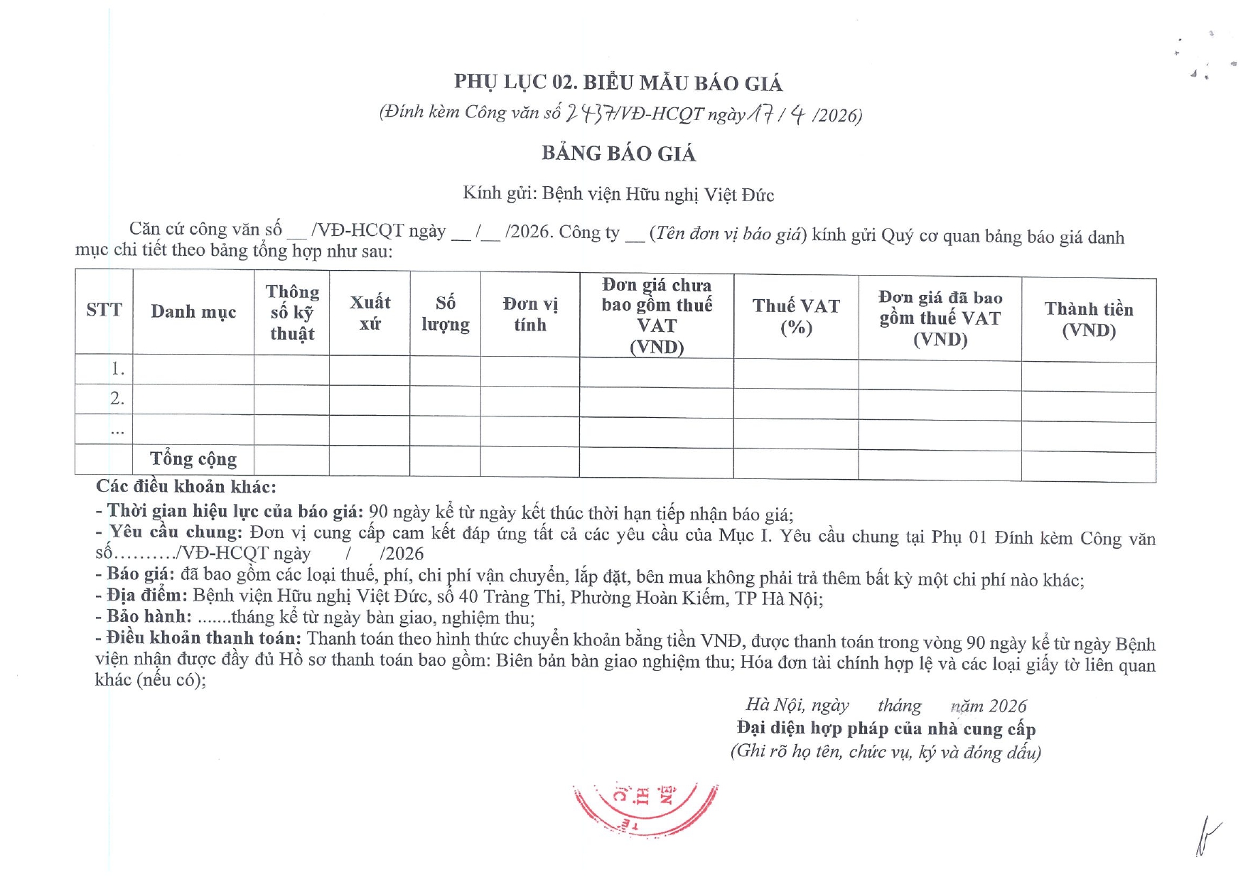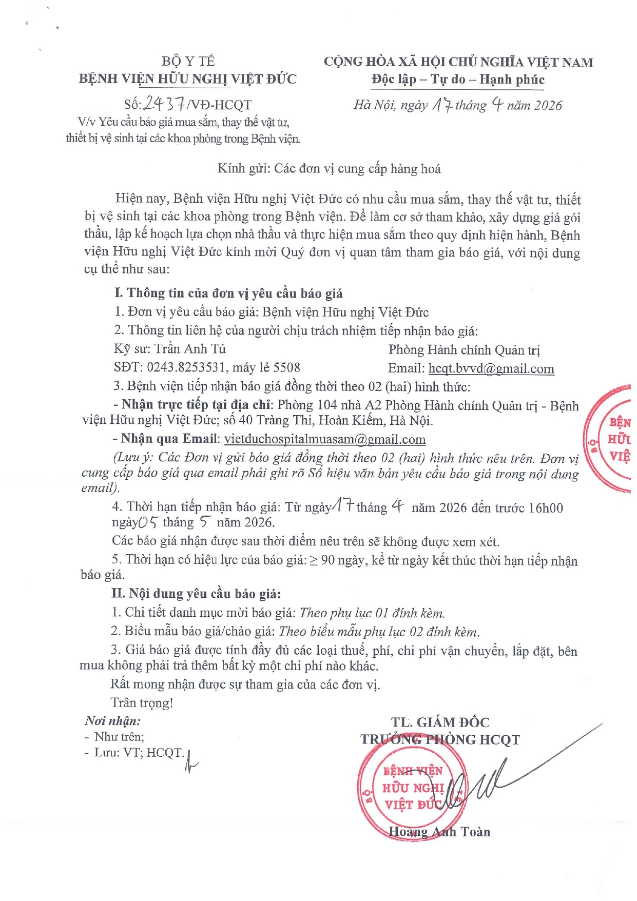Hiện nay, Bệnh viện Hữu nghị Việt Đức có nhu cầu mua sắm, thay thế vật tư, thiết bị vệ sinh tại các khoa phòng trong Bệnh viện. Để làm cơ sở tham khảo, xây dựng giá gói thầu, lập kế hoạch lựa chọn nhà thầu và thực hiện mua sắm theo quy định hiện hành, Bệnh viện Hữu nghị Việt Đức kính mời Quý đơn vị quan tâm tham gia báo giá, với nội dung cụ thể như sau: