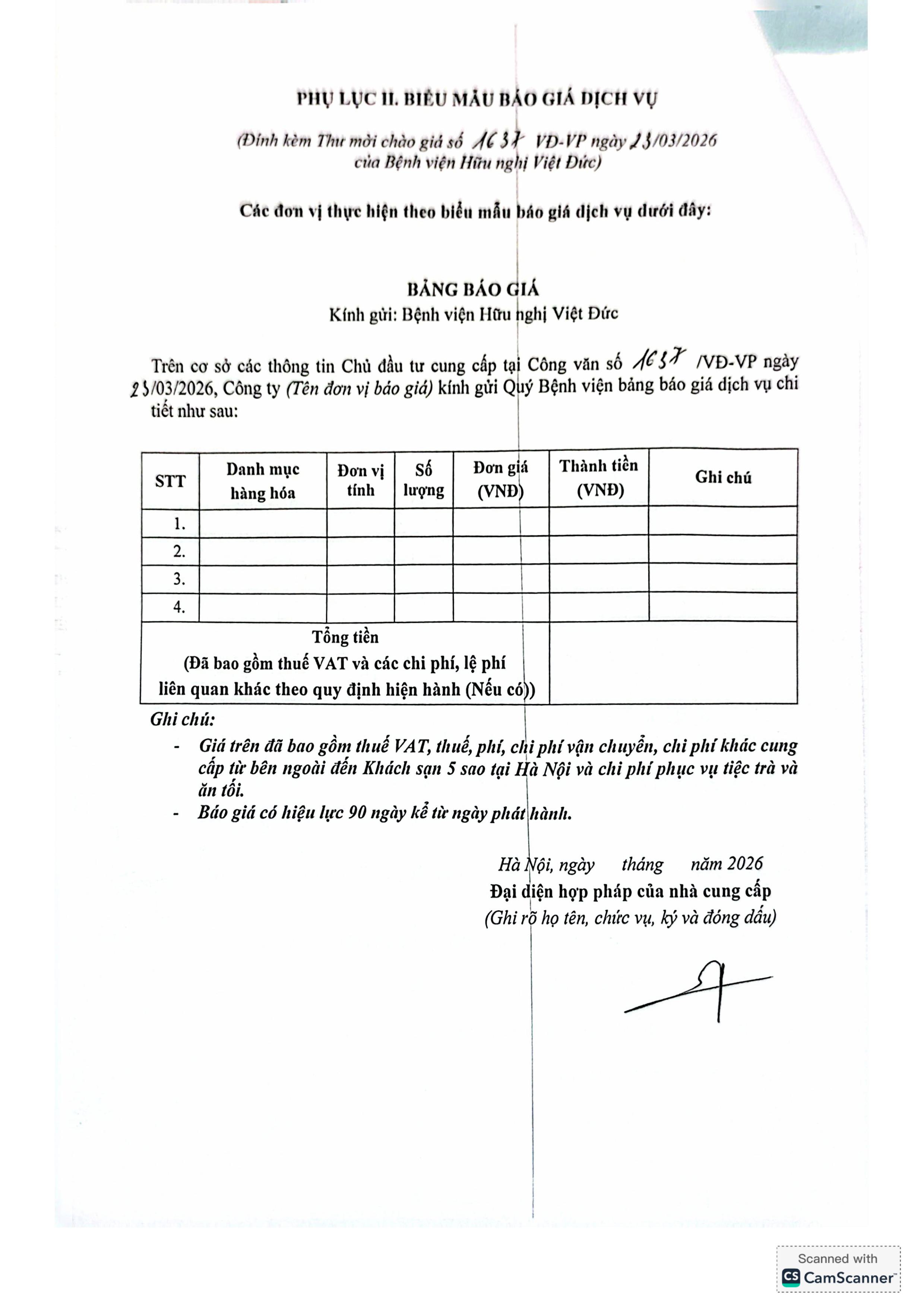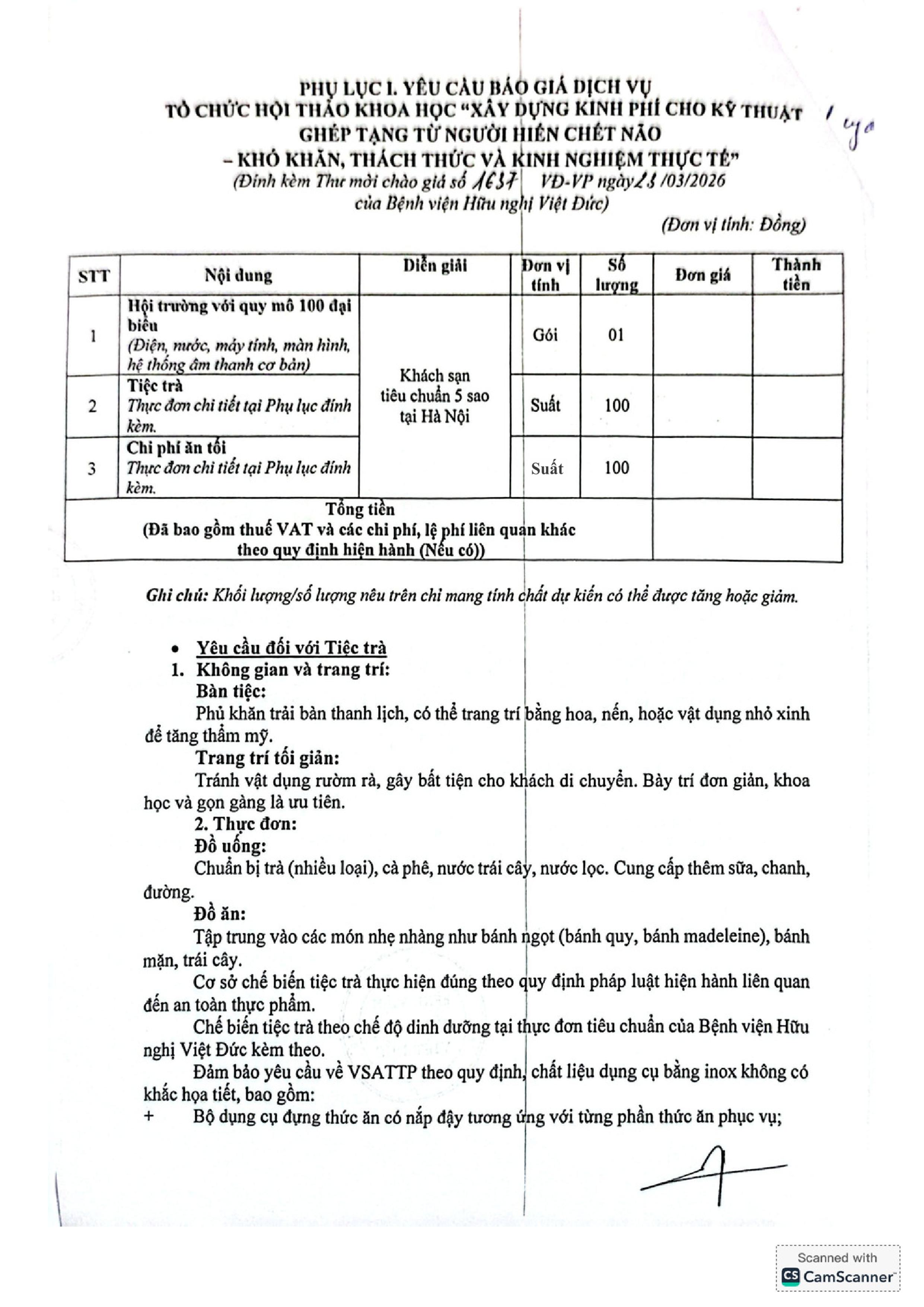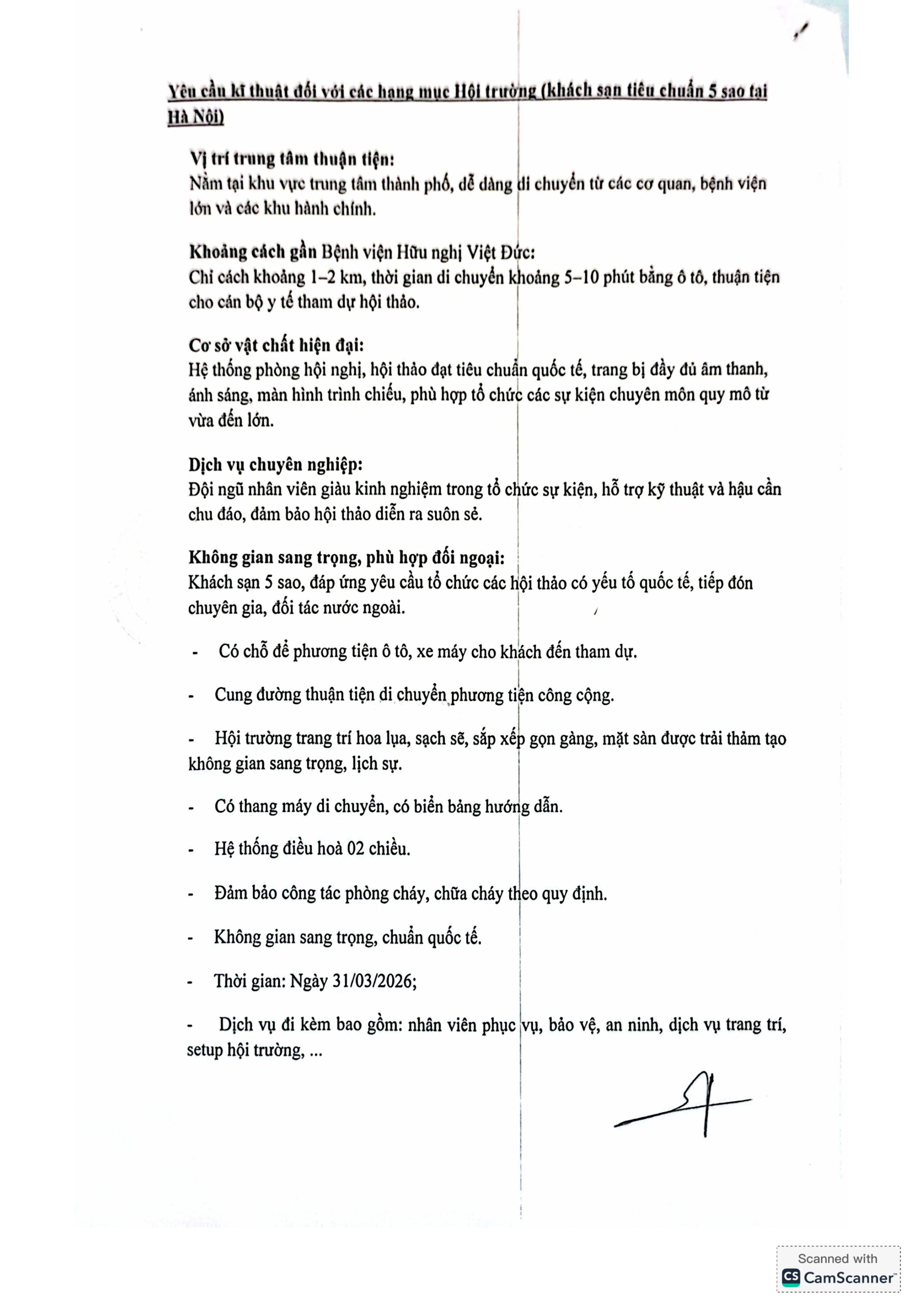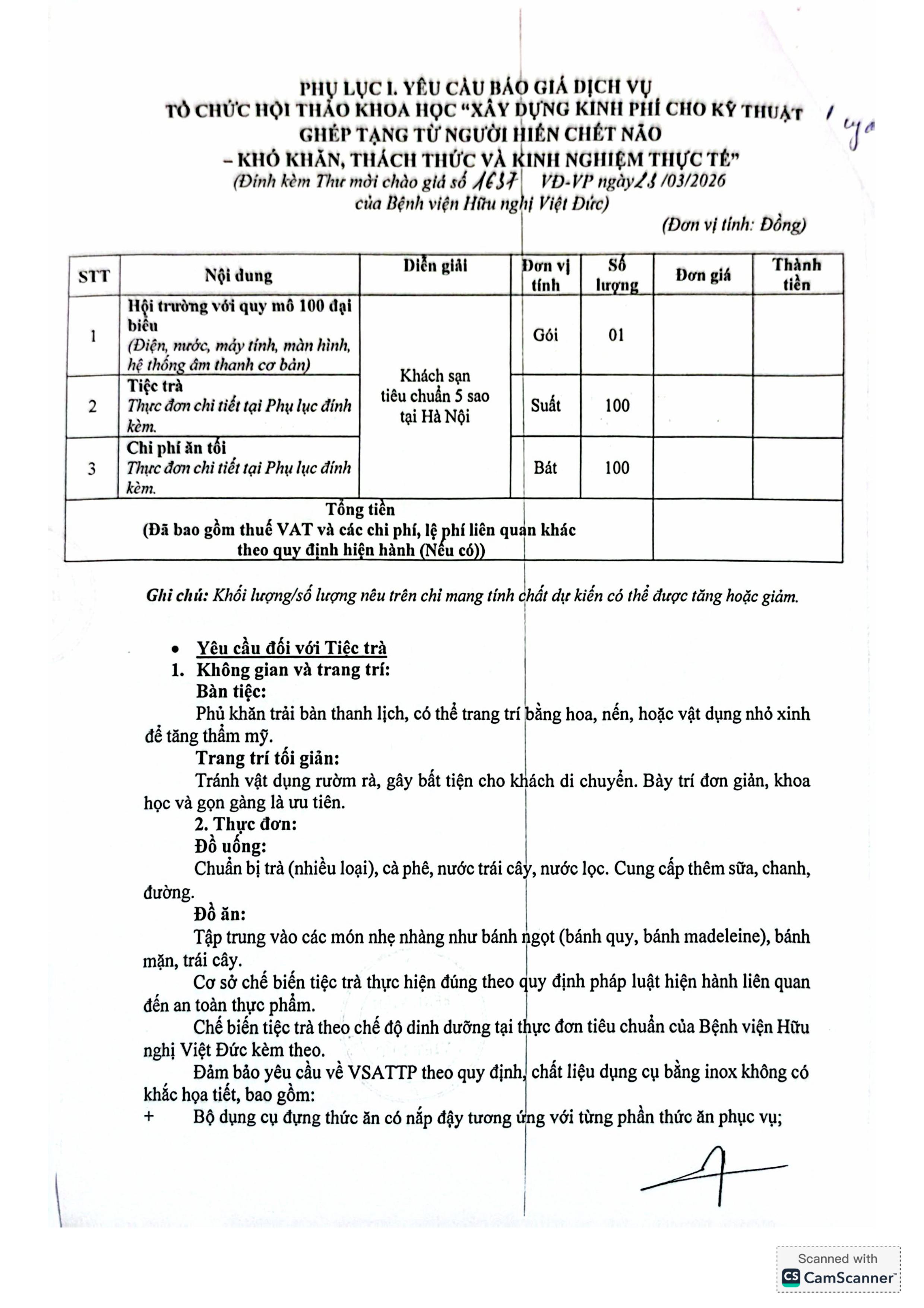 Bệnh viện Hữu nghị Việt Đức có nhu cầu tiếp nhận báo giá để cung cấp dịch vụ tổ chức Hội thảo khoa học “Xây dựng kinh phí cho kỹ thuật ghép tạng từ người hiến chết não – Khó khăn, thách thức và kinh nghiệm thực tế” ngày 31/03/2026, với nội dung cụ thể như sau: