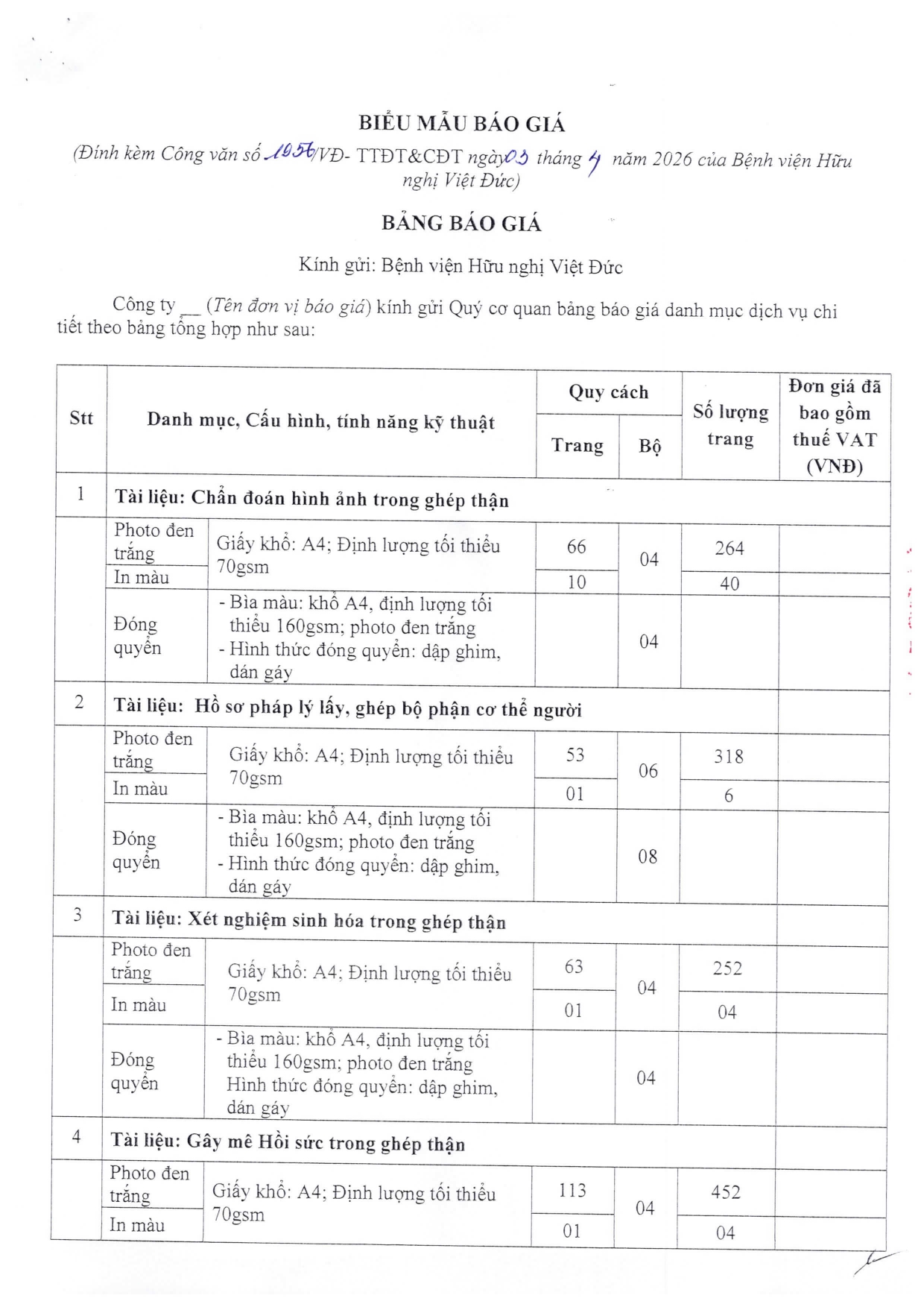 Bệnh viện Hữu nghị Việt Đức có nhu cầu yêu cầu báo giá cung cấp dịch vụ in ấn, photo tài liệu