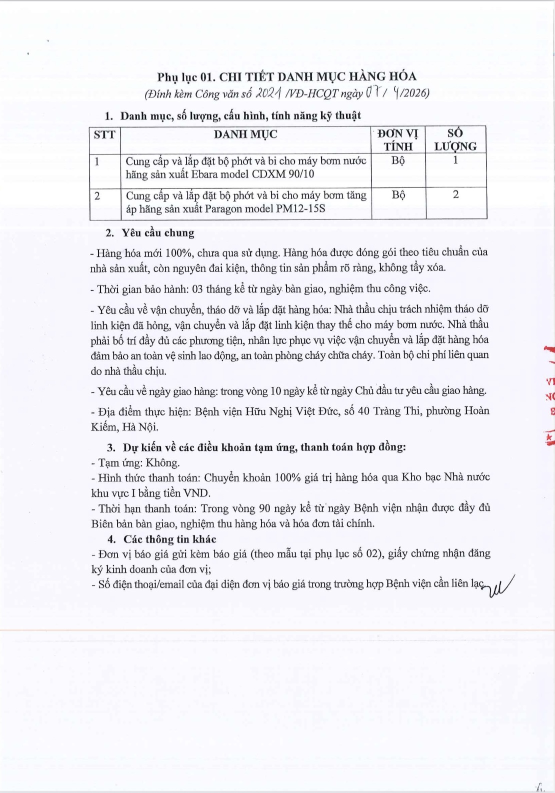 Bệnh viện Hữu nghị Việt Đức có nhu cầu Yêu cầu báo giá cung cấp linh kiện phục vụ sửa chữa máy bơm nước tại tầng mái nhà H