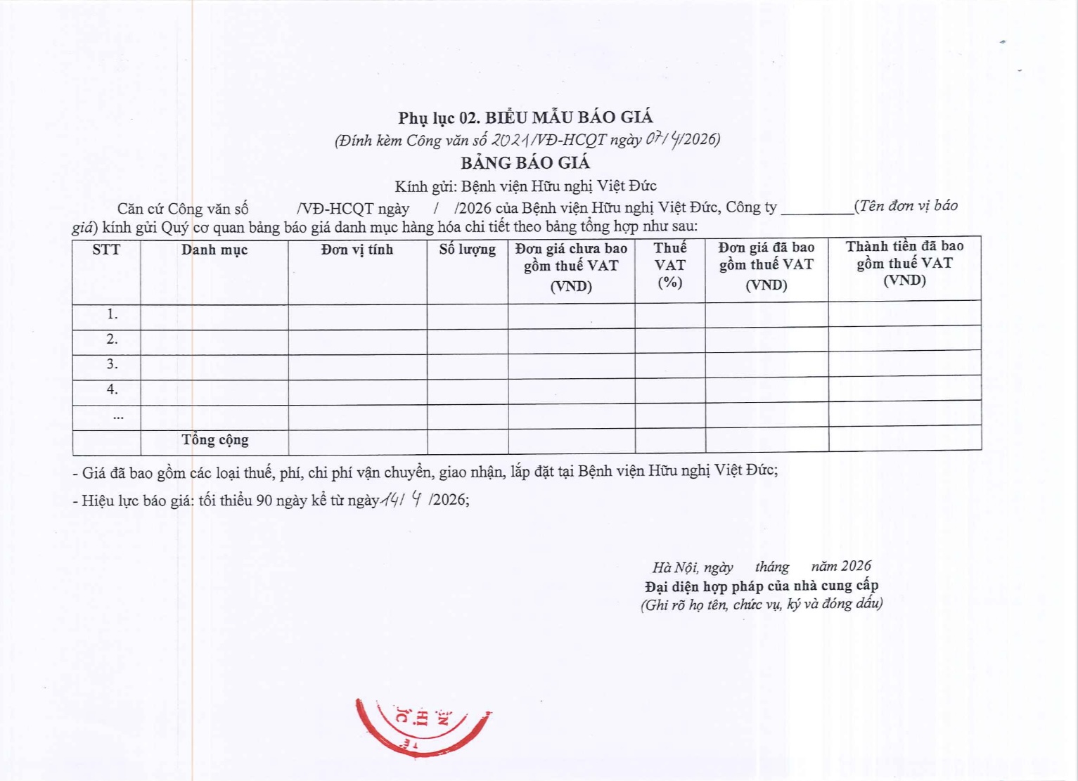 Bệnh viện Hữu nghị Việt Đức có nhu cầu mua sắm linh kiện phục vụ sửa chữa máy bơm nước. Để có cơ sở tham khảo giá mặt hàng linh kiện của máy bơm nước trên thị trường, Bệnh viện Hữu nghị Việt Đức kính mời các đơn vị có khả năng cung cấp báo giá mặt hàng trên với nội dung cụ thể như sau: