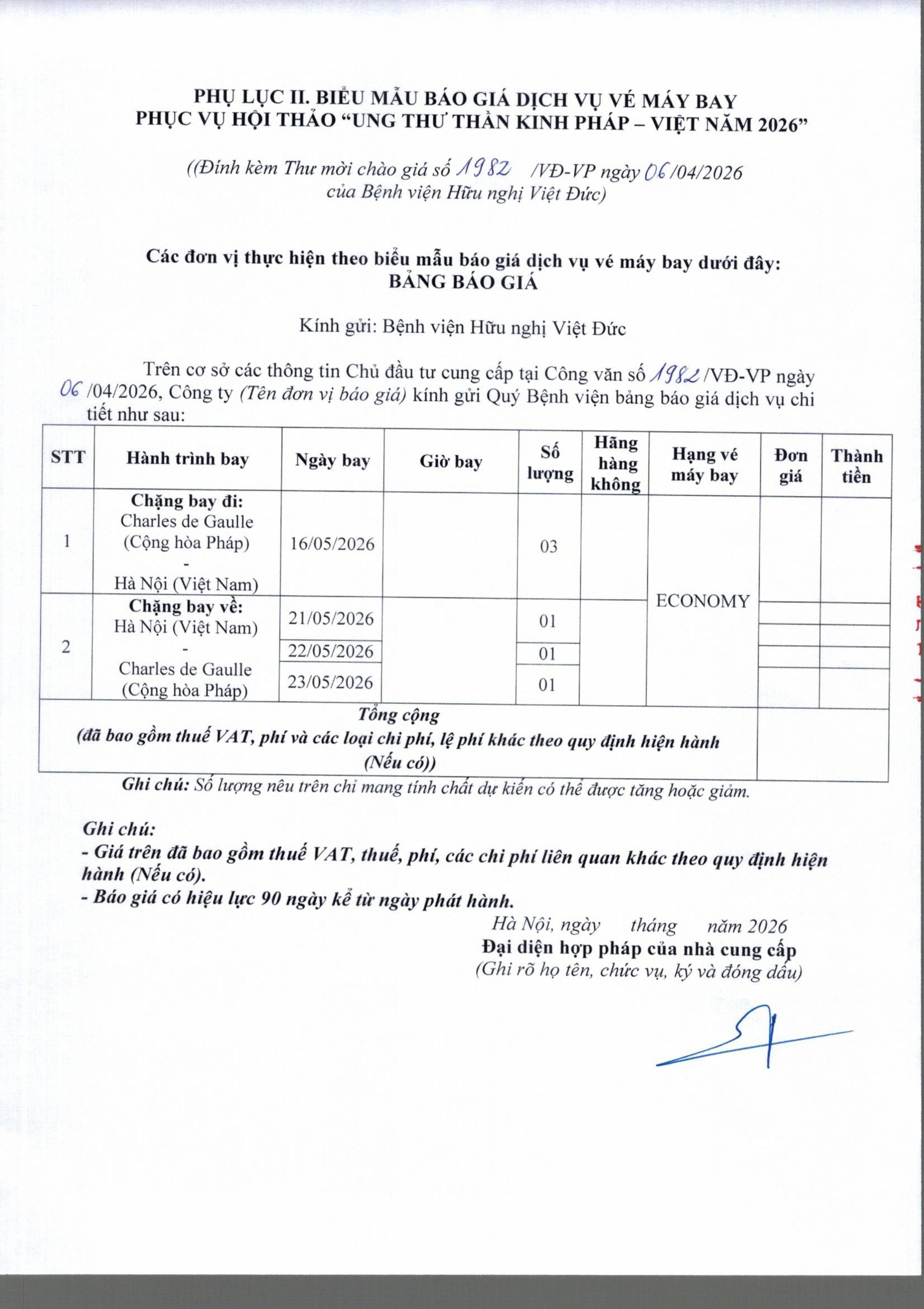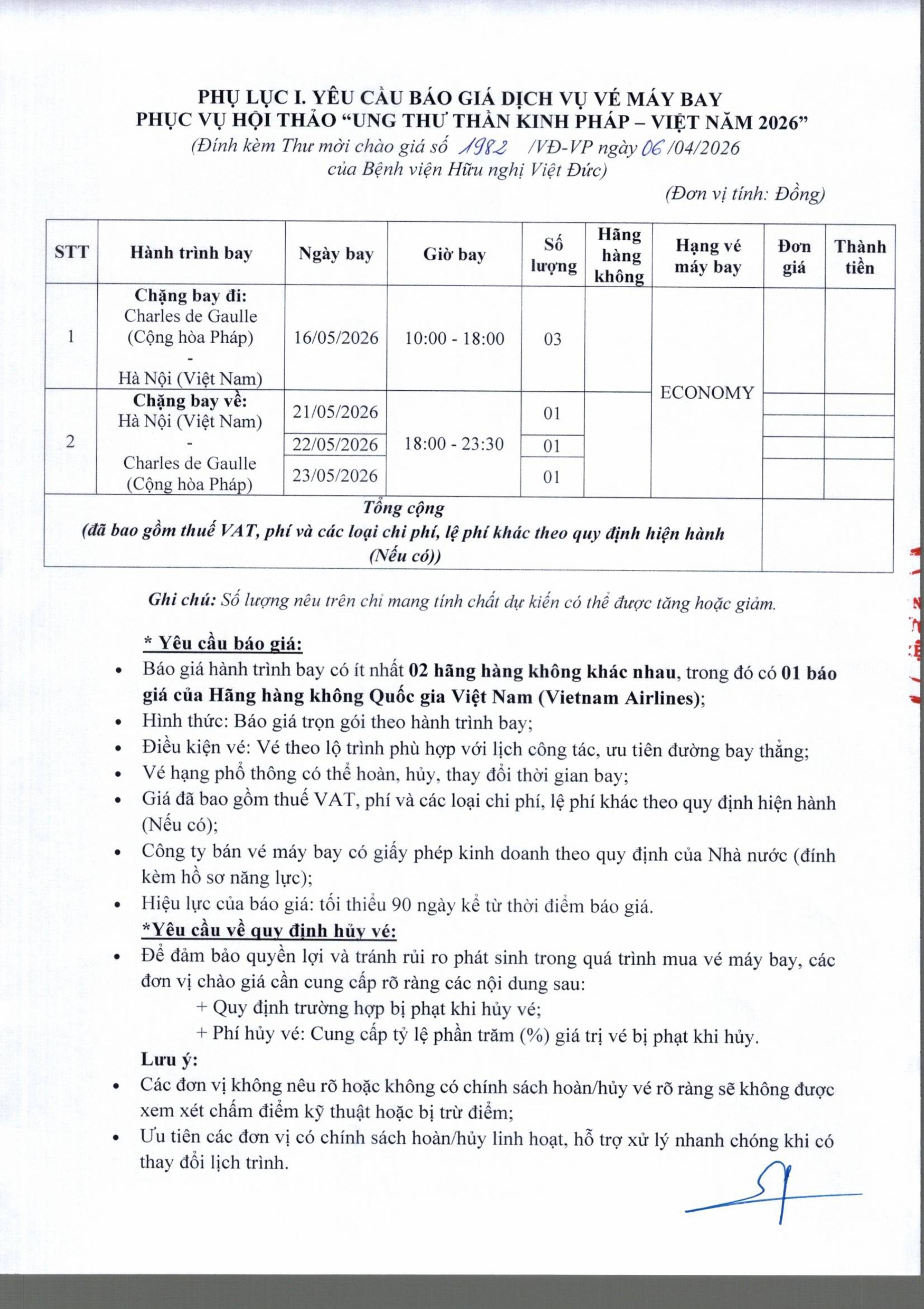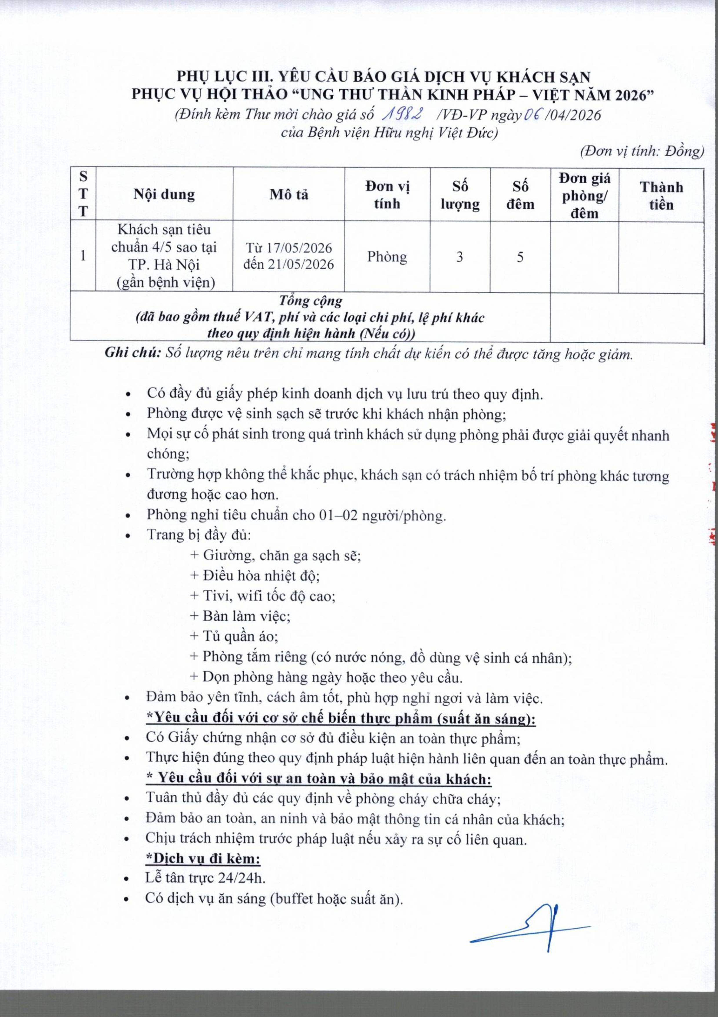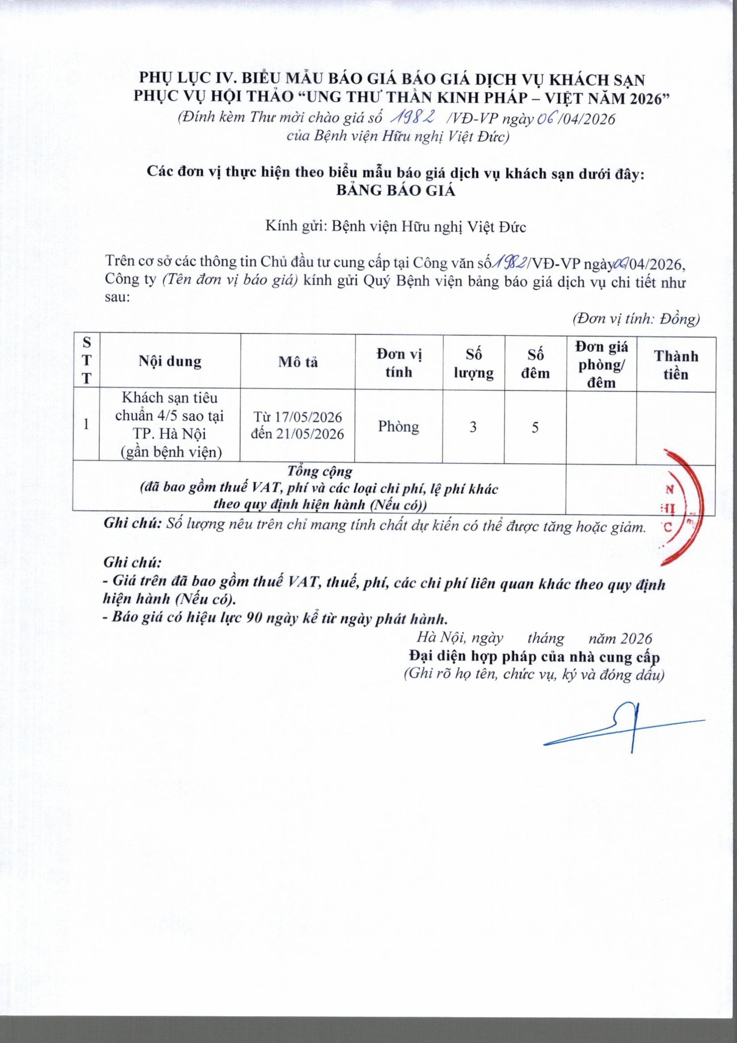 Bệnh viện Hữu nghị Việt Đức có nhu cầu tiếp nhận báo giá để cung cấp dịch vụ tổ chức Hội thảo “Ung thư thần kinh Pháp – Việt năm 2026”, với nội dung cụ thể như sau: