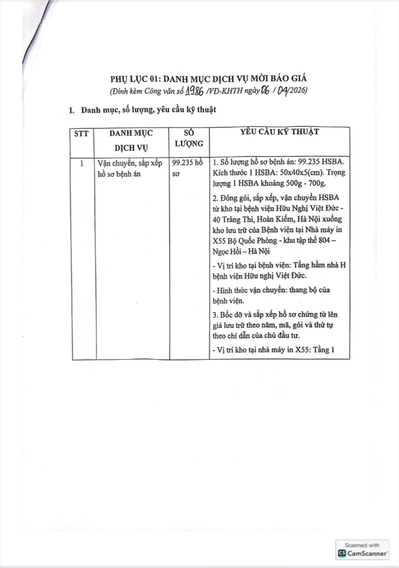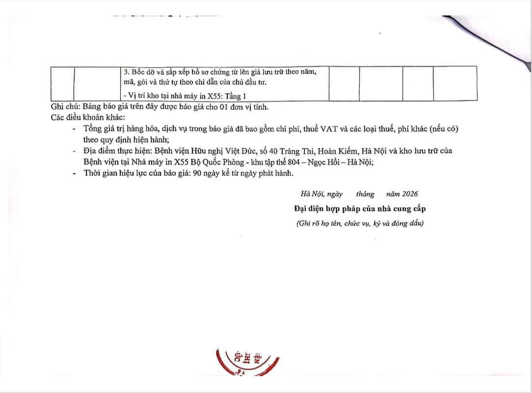 Bệnh viện Hữu Nghị Việt Đức có nhu cầu Yêu cầu báo giá dịch vụ vận chuyển và sắp xếp Hồ sơ bệnh án năm 2025