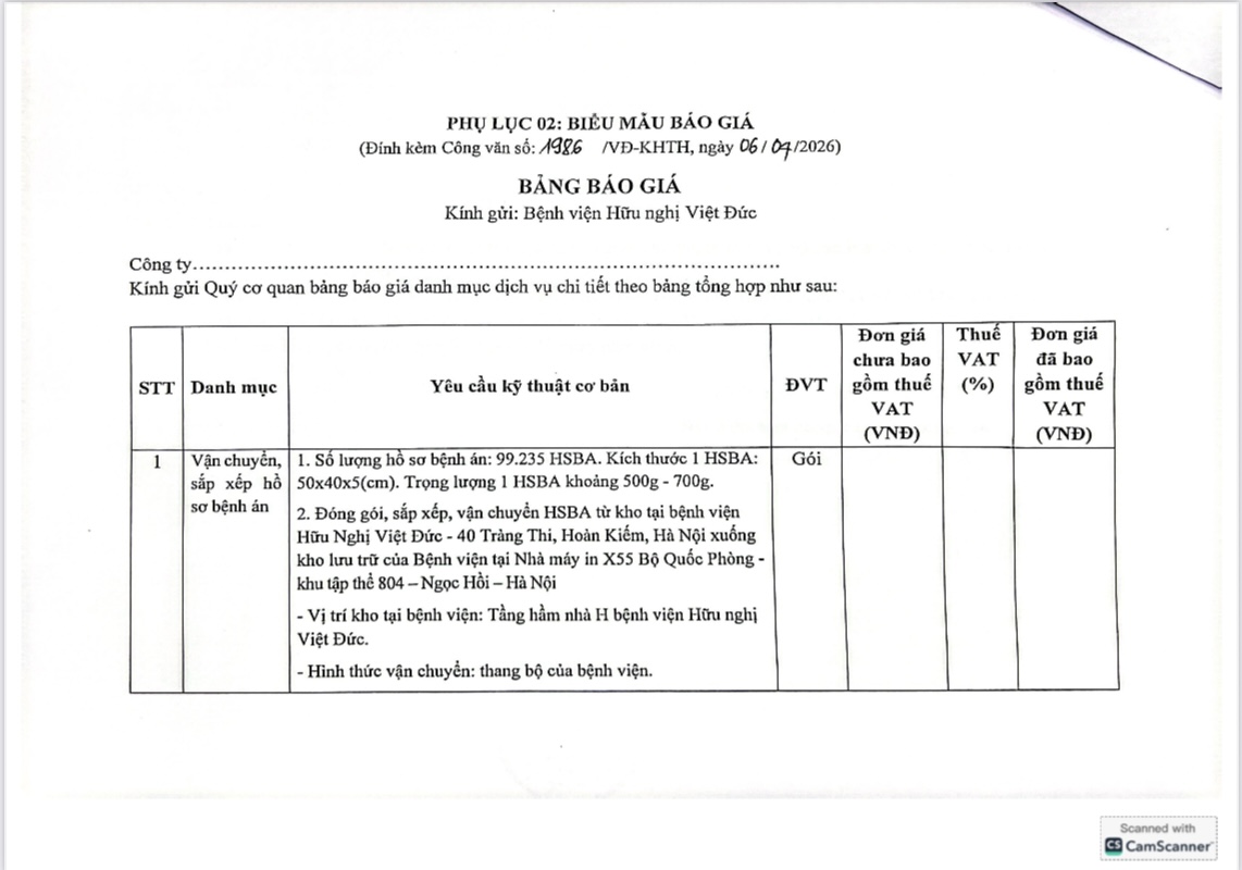 Bệnh viện Hữu Nghị Việt Đức có nhu cầu tiếp nhận báo giá để tham khảo, xây dựng giá gói thầu, làm cơ sở tổ chức lựa chọn nhà thầu cho gói thầu cung cấp dịch vụ vận chuyển và sắp xếp hồ sơ bệnh án 2025 với nội dung cụ thể như sau: