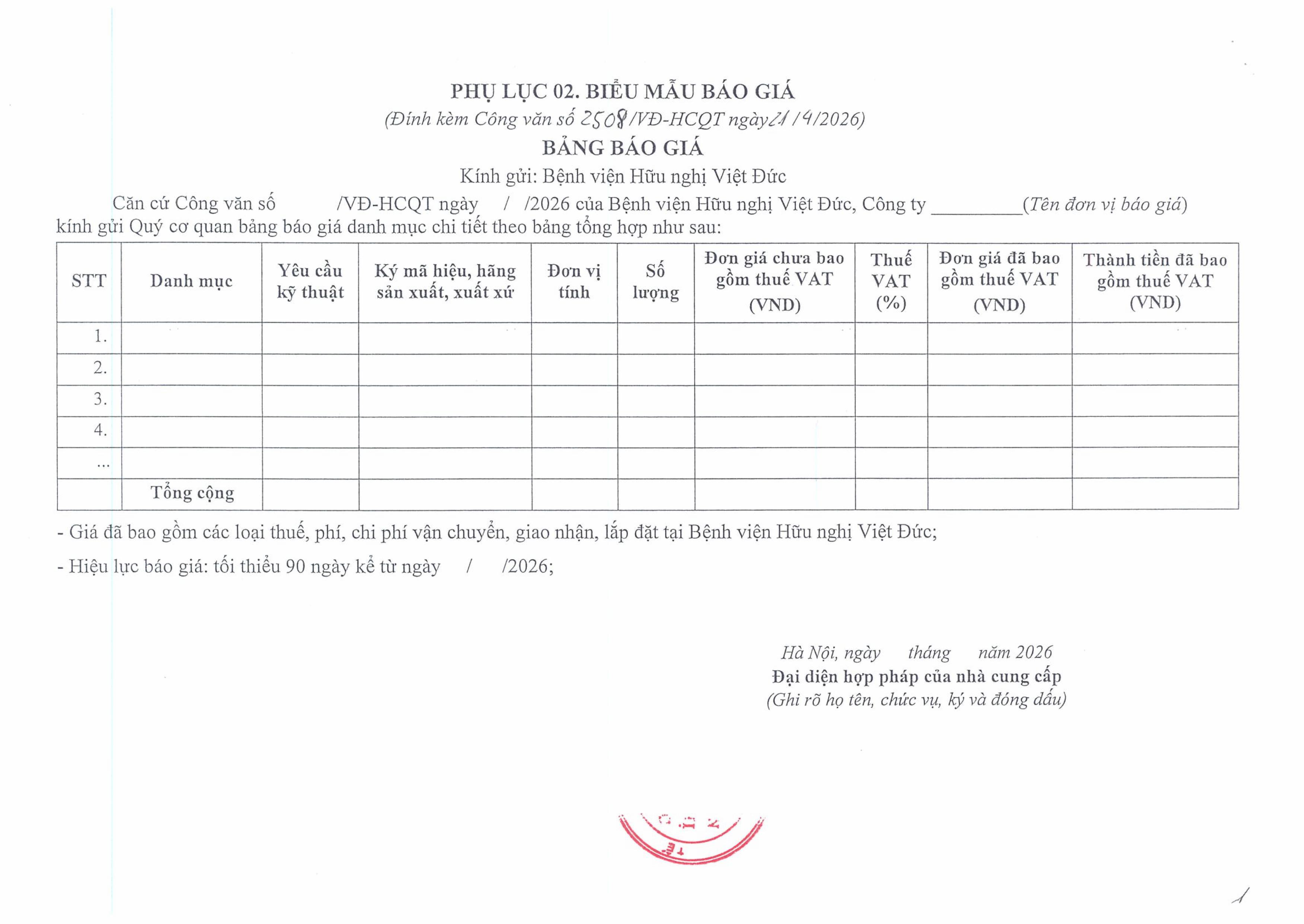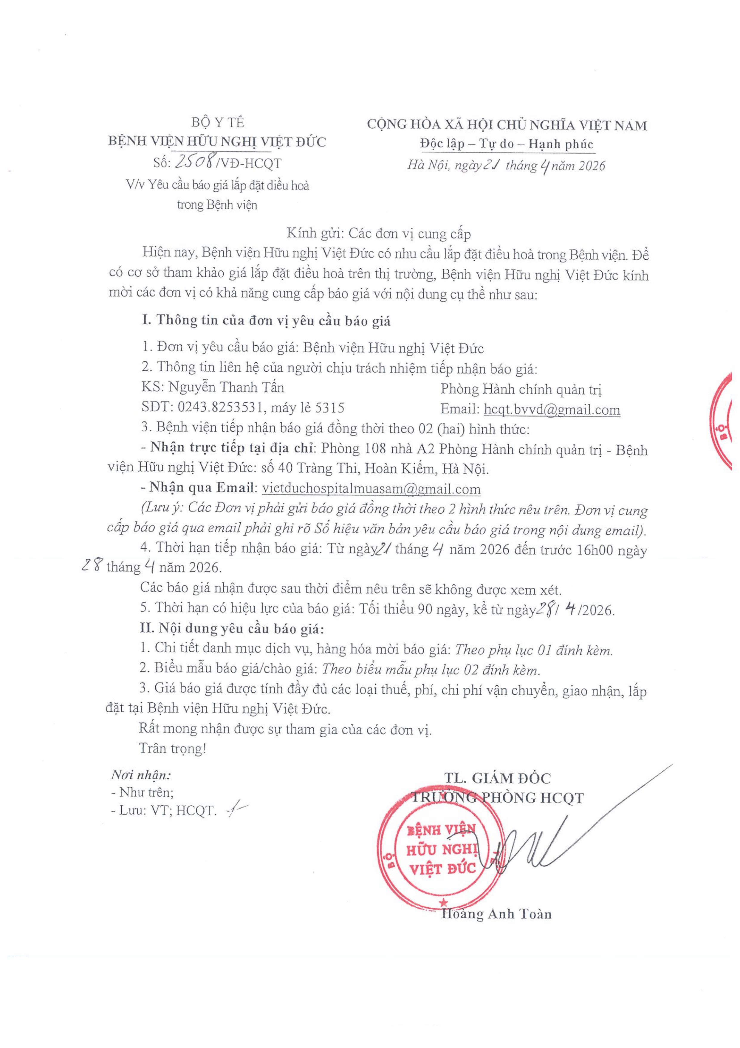 Hiện nay, Bệnh viện Hữu nghị Việt Đức có nhu cầu lắp đặt điều hoà trong Bệnh viện. Để có cơ sở tham khảo giá lắp đặt điều hoà trên thị trường, Bệnh viện Hữu nghị Việt Đức kính mời các đơn vị có khả năng cung cấp báo giá với nội dung cụ thể như sau: