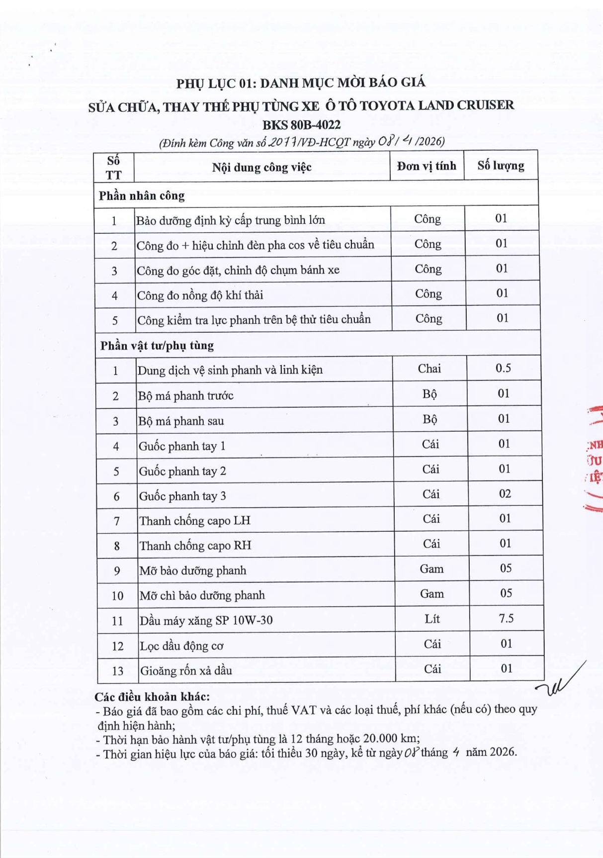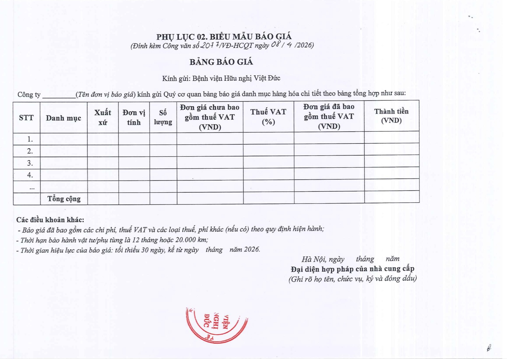 Bệnh viện Hữu nghị Việt Đức có nhu cầu sửa chữa, thay thế phụ tùng xe ô tô Toyota Land Cruiser BKS 80B-4022 của Bệnh viện. Để có cơ sở tham khảo giá các đơn vị sửa chữa trên thị trường, Bệnh viện Hữu nghị Việt Đức kính mời Quý đơn vị có khả năng sửa chữa báo giá với nội dung cụ thể như sau: