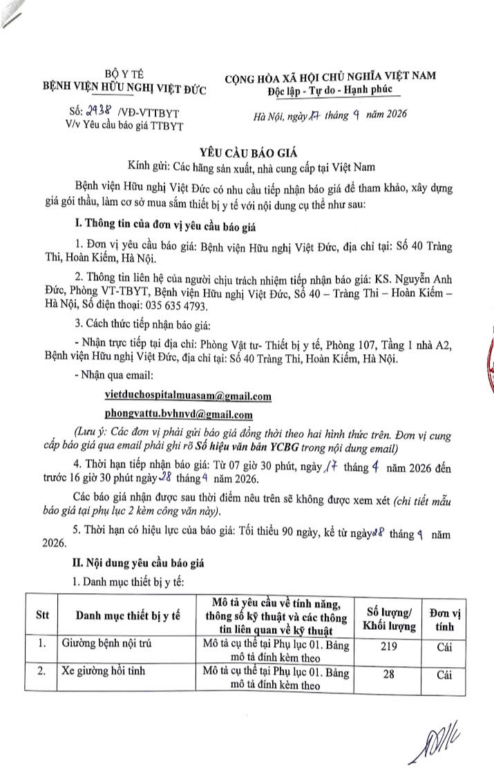 Bệnh viện Hữu nghị Việt Đức có nhu cầu tiếp nhận báo giá để tham khảo, xây dựng giá gói thầu, làm cơ sở mua sắm thiết bị y tế với nội dung cụ thể như sau: TẠI ĐÂY